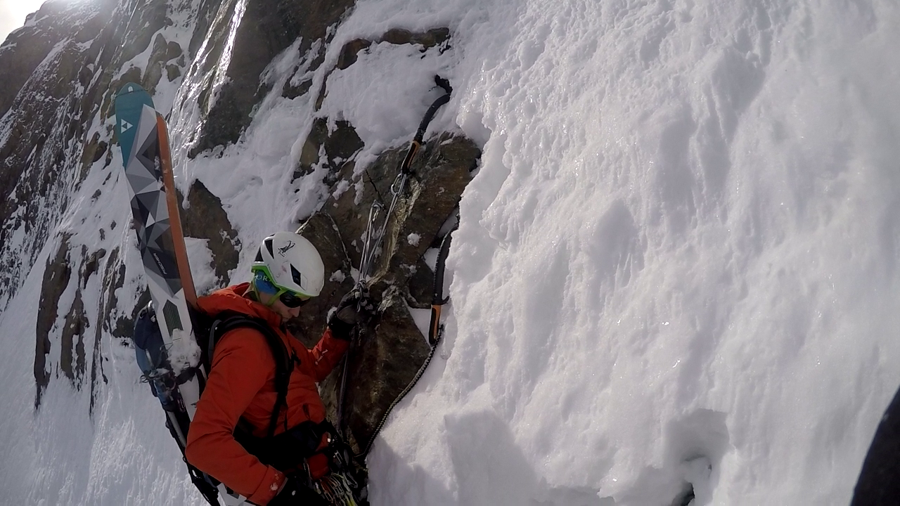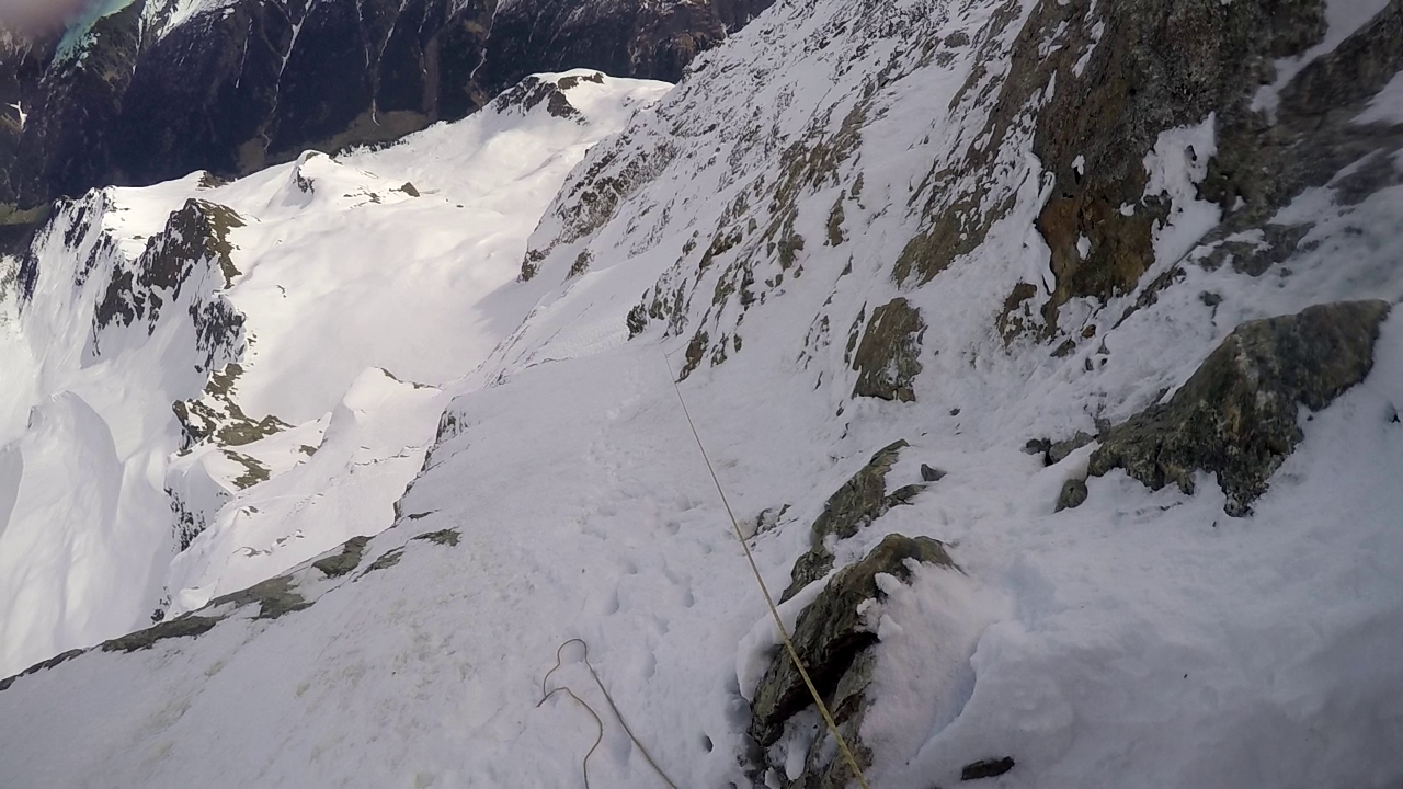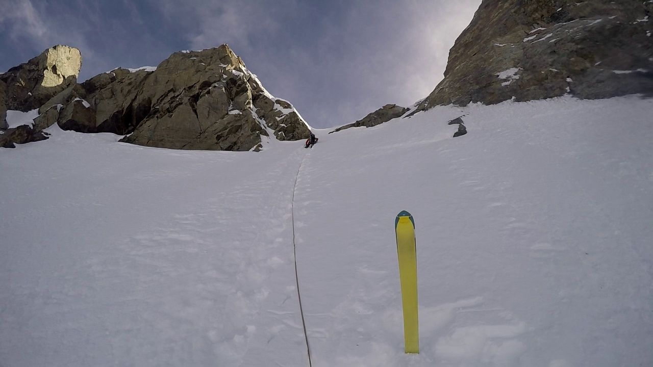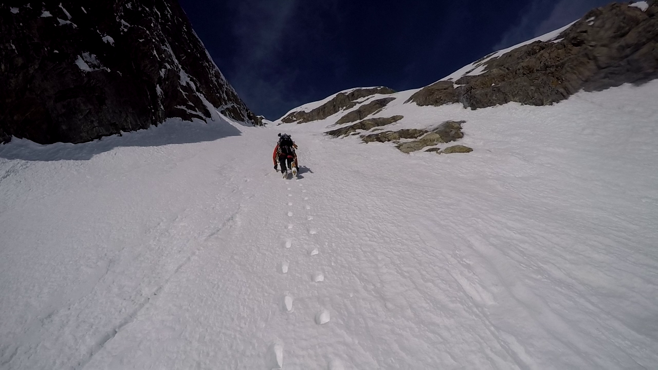 5. SL: Letzte und auch schwerste Seillänge vor Erreichen des oberen Schneefeldes. Die Seillänge führt 15m über eingeschneite Felsplatten bevor das Schneefeld erreicht wird. Eine Absicherung war bei unserer Begehung sehr schwer möglich. Stand kann im Schneefeld mittels Totem Mann gemacht werden.