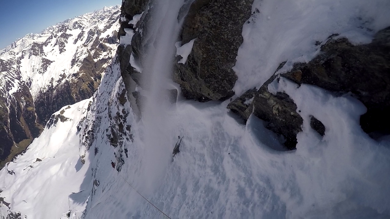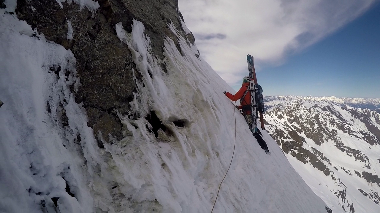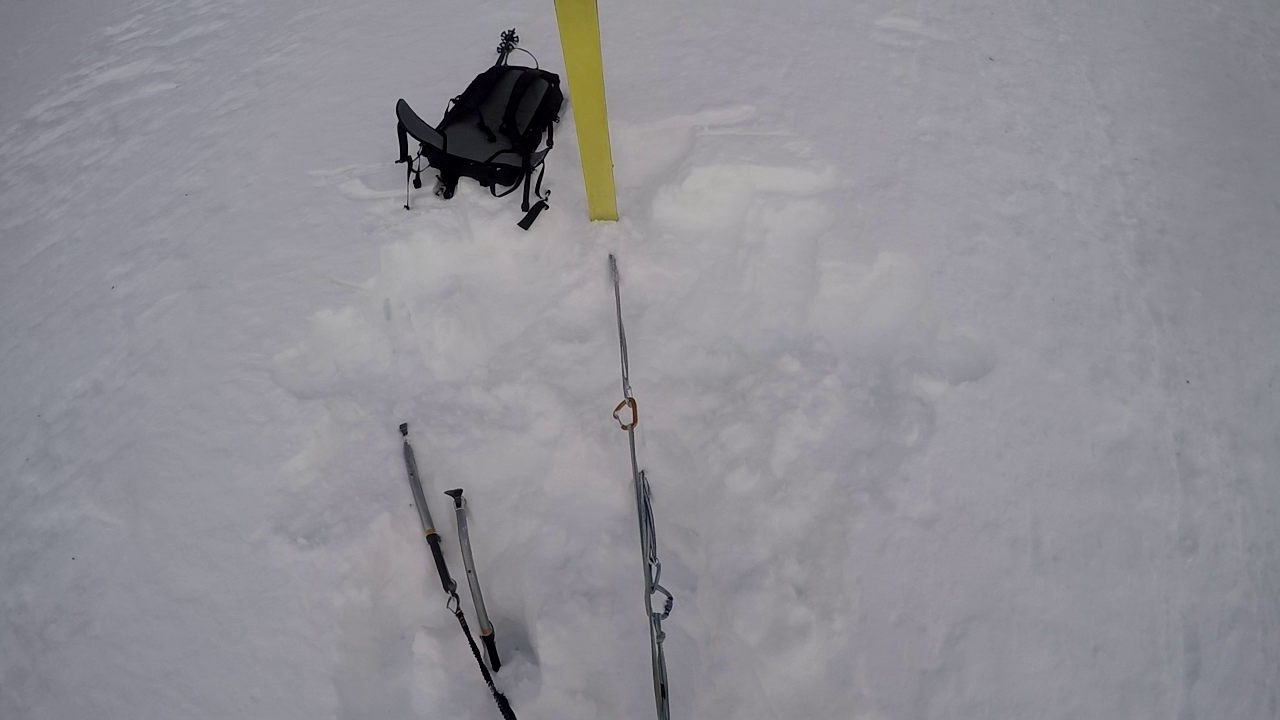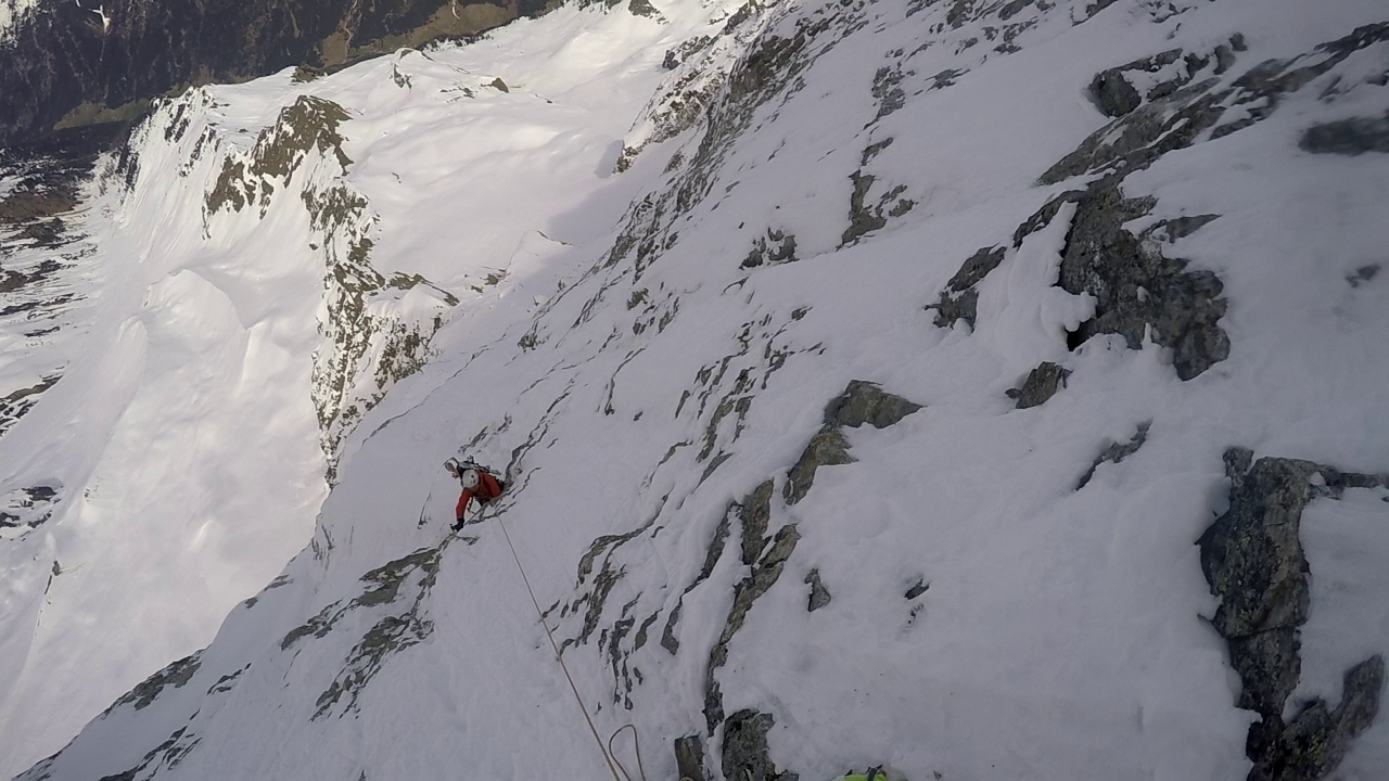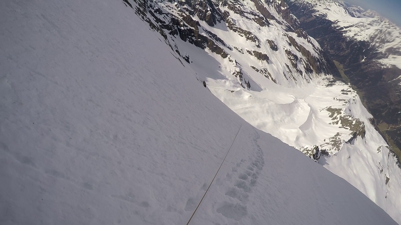 5. SL: Letzte und auch schwerste Seillänge vor Erreichen des oberen Schneefeldes. Die Seillänge führt 15m über eingeschneite Felsplatten bevor das Schneefeld erreicht wird. Eine Absicherung war bei unserer Begehung sehr schwer möglich. Stand kann im Schneefeld mittels Totem Mann gemacht werden.