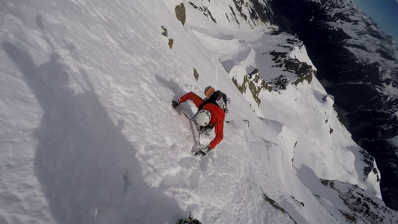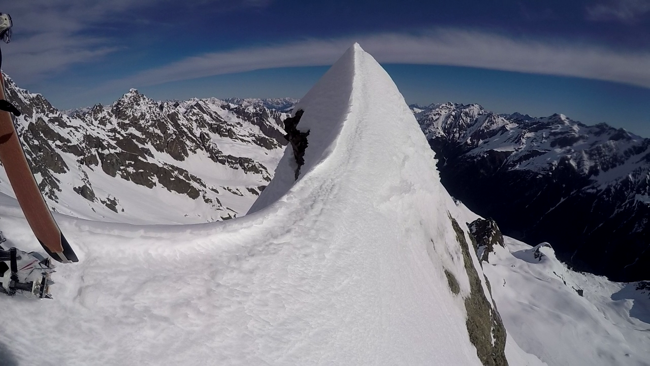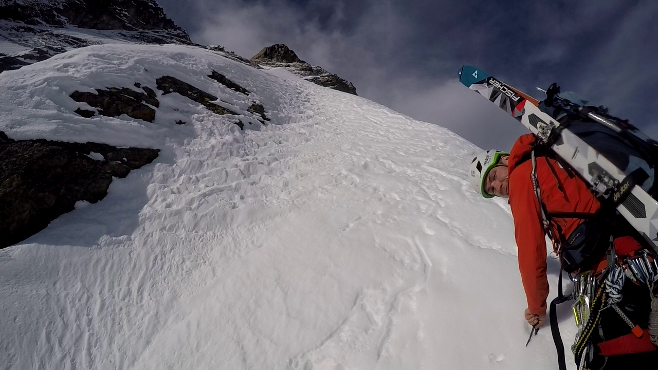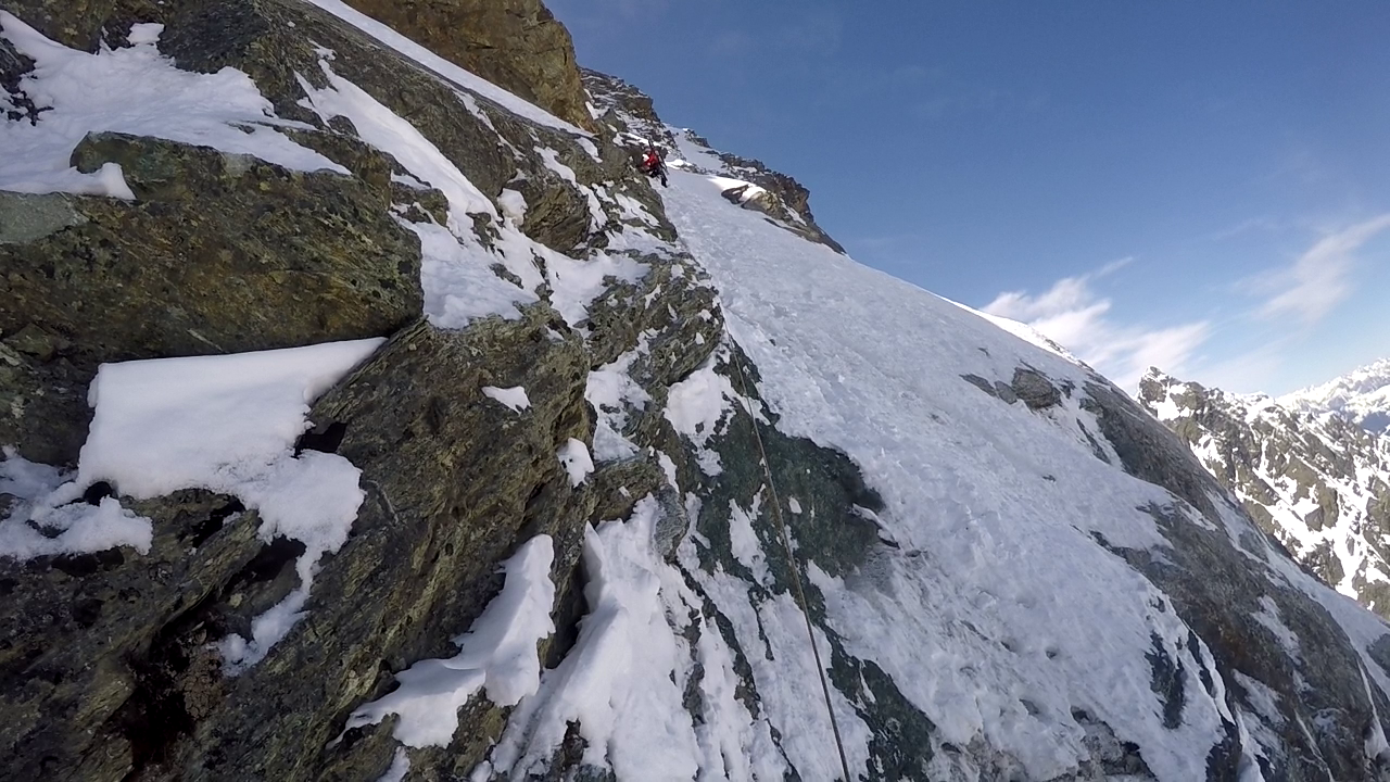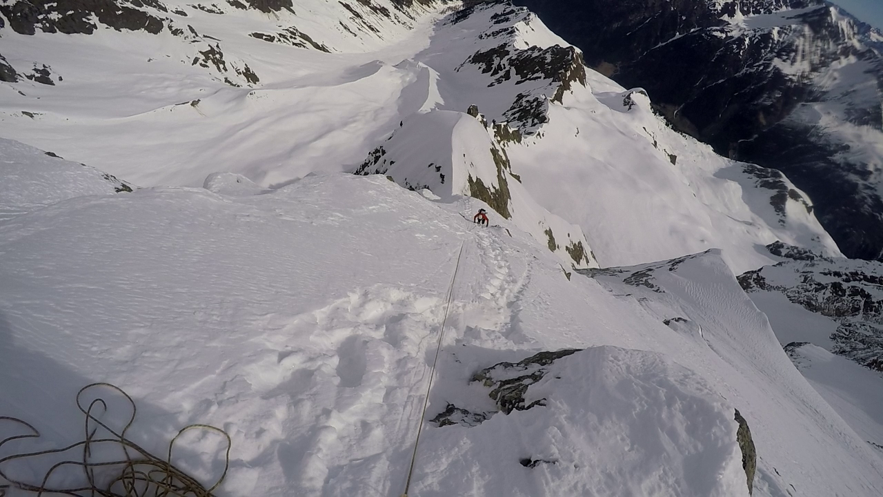 Ende der Hauptschwierigkeiten. Nun geht es weitere 80m das Schneefeld empor bis zur gut erkennbaren Scharte. Diese muss nochmals in leichter Mixedkletterei und Wühlerei (Wechte) erklommen werden. Anschließend immer dem leichtesten Weg folgend, leicht ansteigend, auf der Südseite des Hauptgipfels bis zu einer kleinen Rinne. Diese noch 10m empor und unschwierig zum Gipfel.