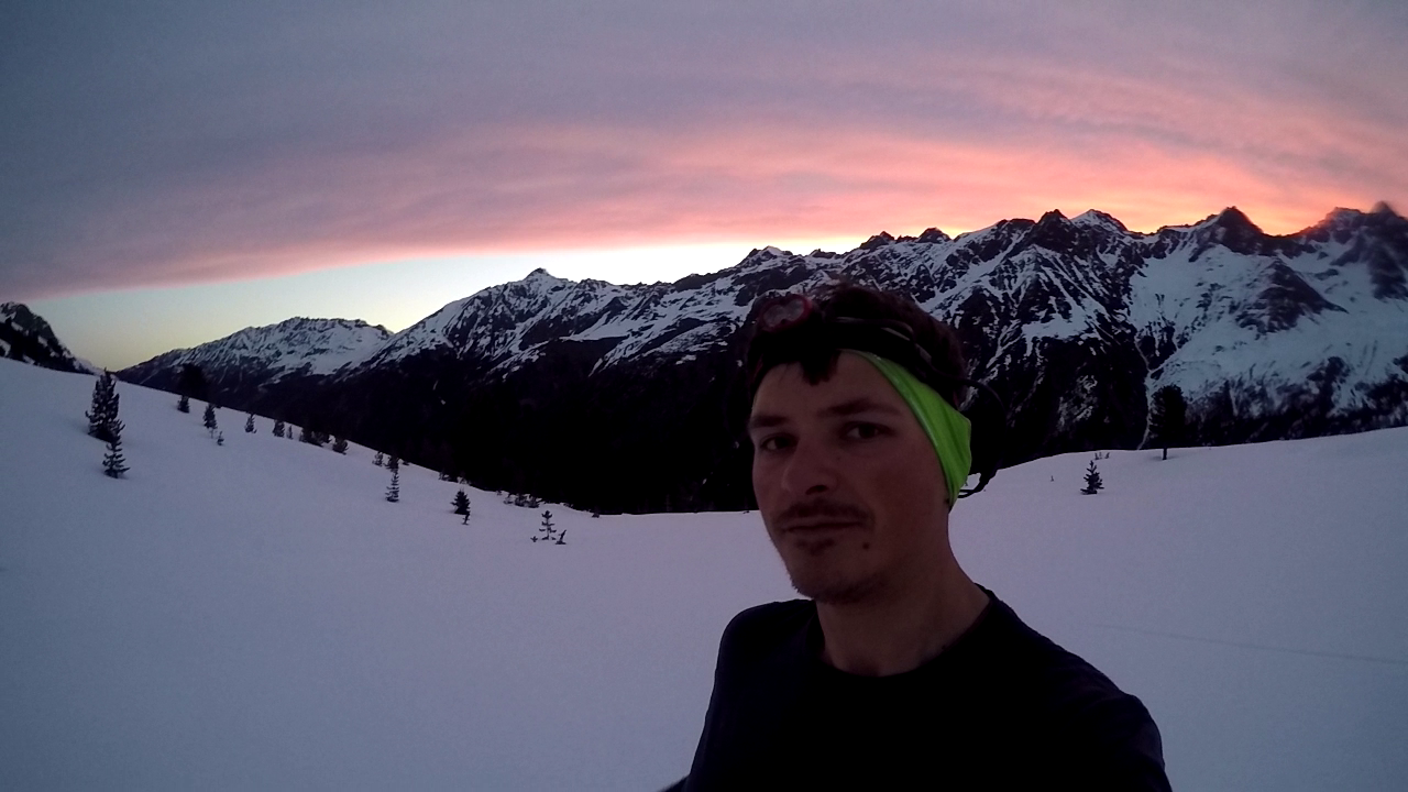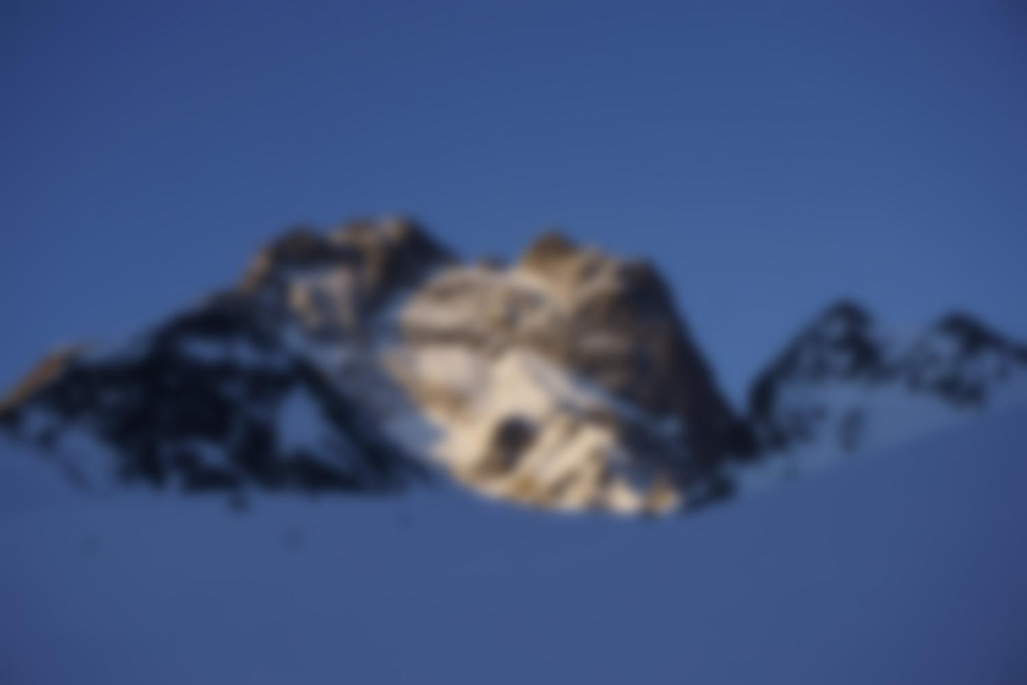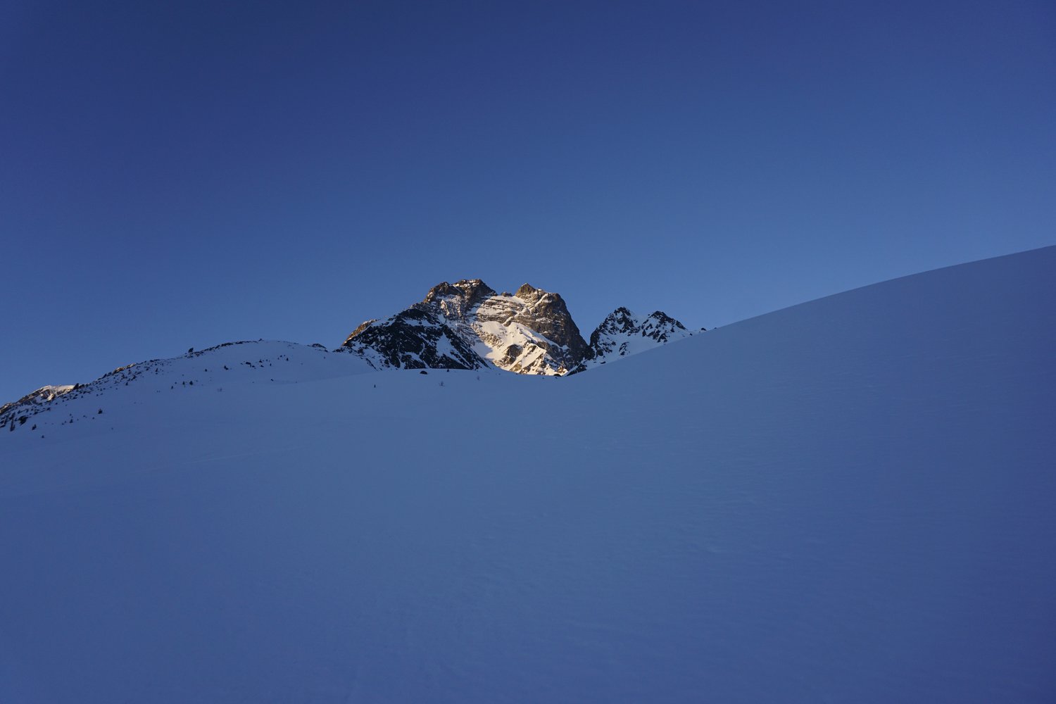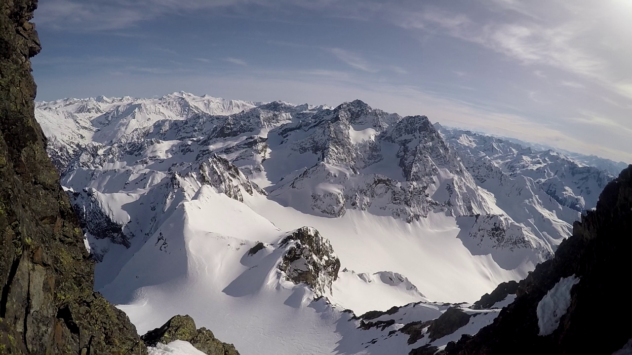 Ende der Hauptschwierigkeiten. Nun geht es weitere 80m das Schneefeld empor bis zur gut erkennbaren Scharte. Diese muss nochmals in leichter Mixedkletterei und Wühlerei (Wechte) erklommen werden. Anschließend immer dem leichtesten Weg folgend, leicht ansteigend, auf der Südseite des Hauptgipfels bis zu einer kleinen Rinne. Diese noch 10m empor und unschwierig zum Gipfel.