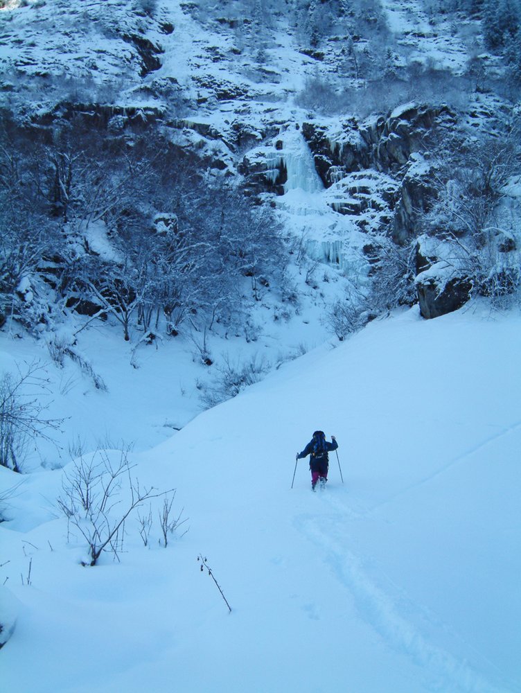 Entweder neben dem Bach hinauf, oder daneben über freie Hänge zum gut sichtbaren Wasserfall.
