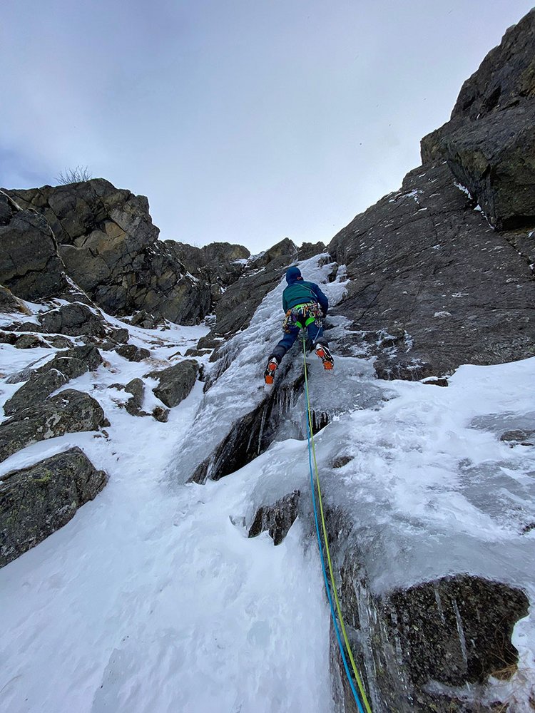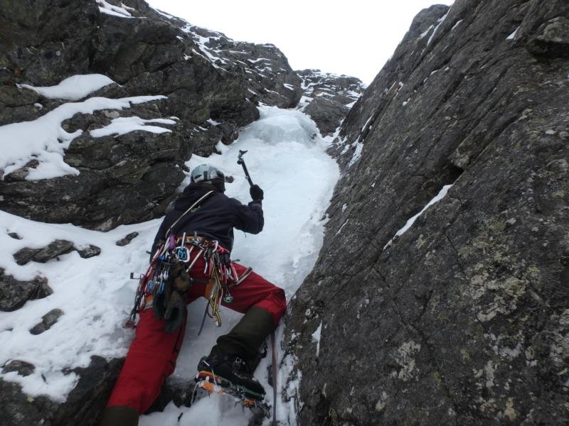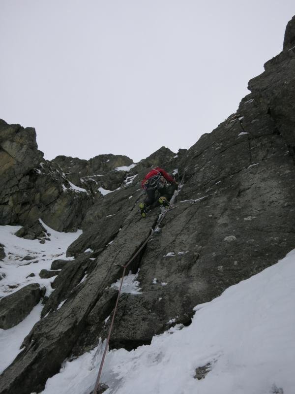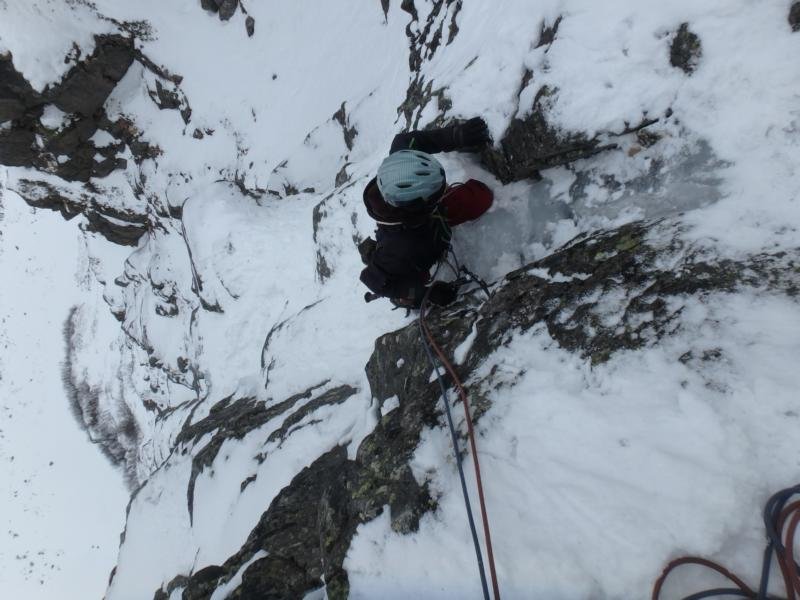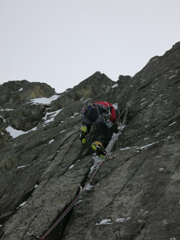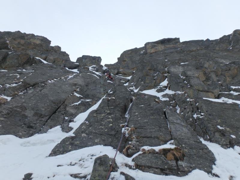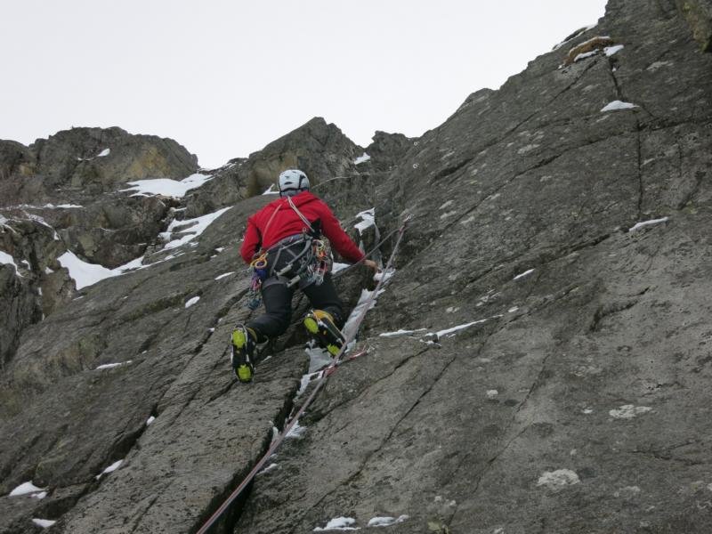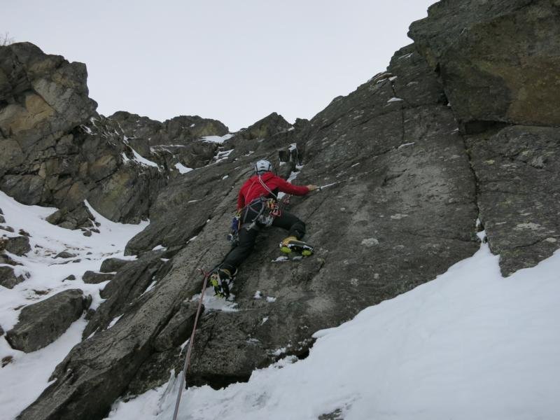Relativ kurze, aber sehr schöne Mixedroute für die einiges an alpiner Erfahrung nötig ist, obwohl es einige Bolts in der Route gibt. Die Route eignet sich als Übungstour für längere alpine Mixedrouten.