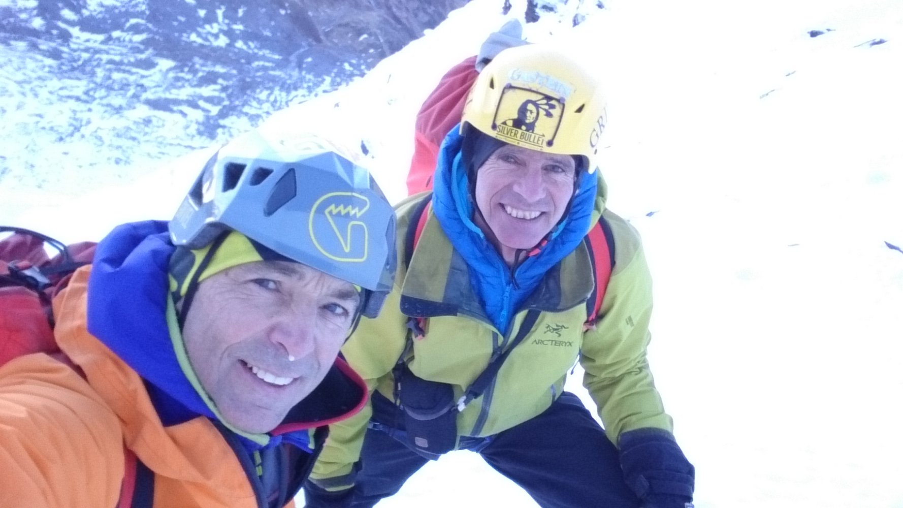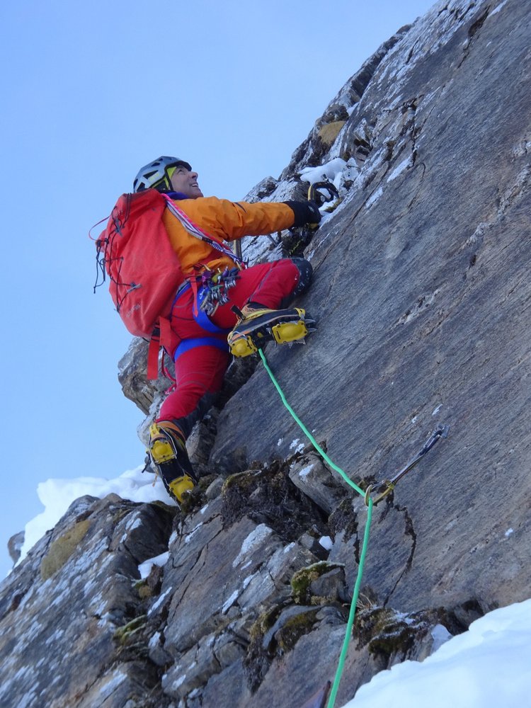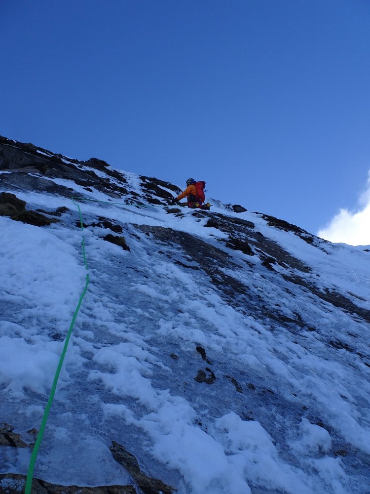 4. SL Die Steilplatte von links 2 BH diagonal nach rechts in heikler Kletterei und ins Eis. Nach 25 m heikler Übergang in flaches Gelände und fast waagrecht weitere 20m zu einem kleinen Fels mit BH Stand in der Rinne. M5, WI 4+