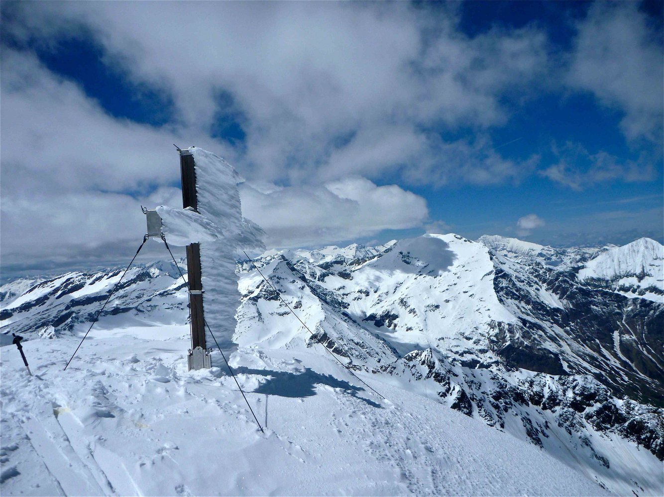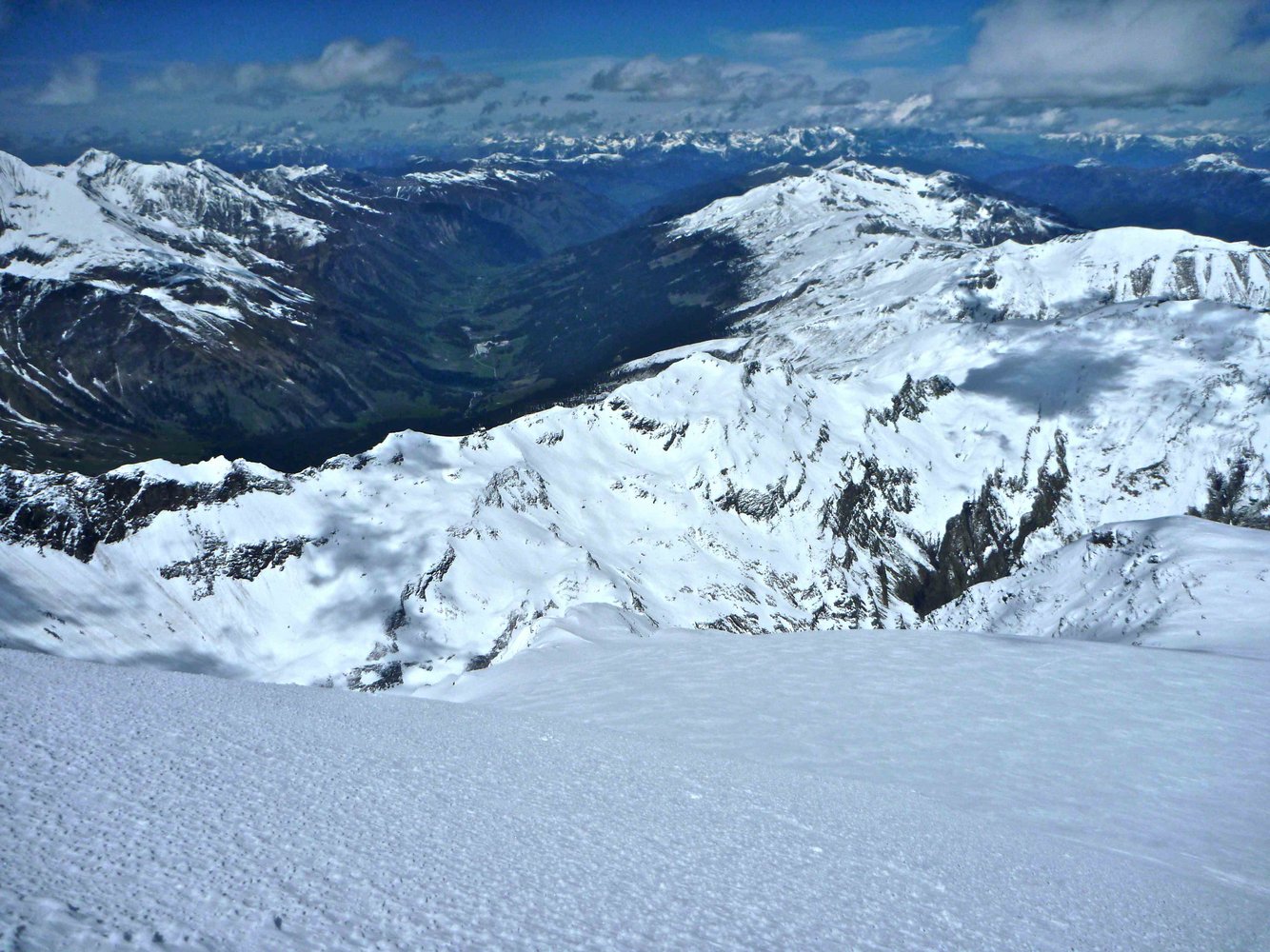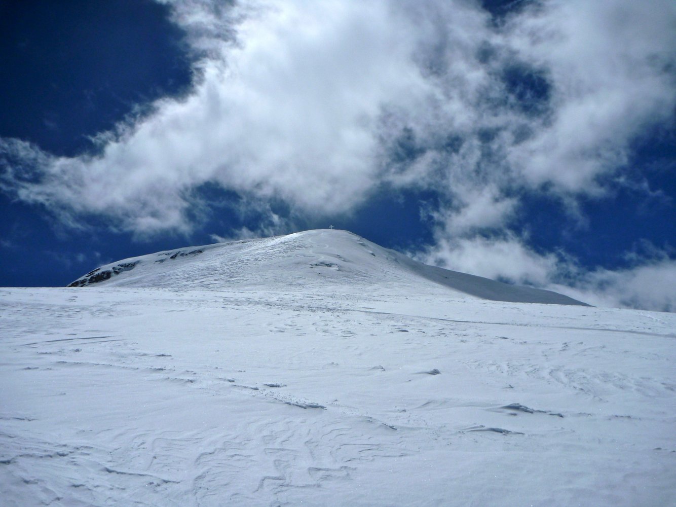 Die mittlere Rinne ist die logische Linie direkt zum Gipfel. Zu Beginn durch einen schmalen Durchschlupf und später in einer breiten Firnrinne nach oben. Im oberen Teil der rechten Rinne bis auf den gut zu erkennenden Grat folgen (kurz vor dem Grat können blanke Stellen auftreten, max 45 Grad) Diesem nun ueber Blockwerk kurz folgen bis man wieder im Firnfeld vor dem Gipfel ist. Diesem bis zum Gipfel folgen.