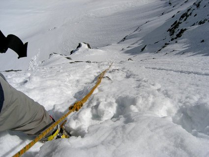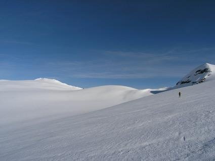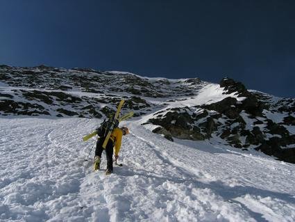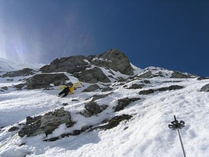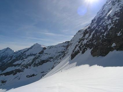 Unten das Firnfeld links vom Pfeiler aufwärts, dann steigt man leicht rechts aufwärts um oben auf einen vermeintlichen Grat zu gelangen - auf diesem gerade aufwärts und rechts an einer großen blockartigen Felswand vorbei zur Ausstiegswechte und über diese ins flache Gelände.