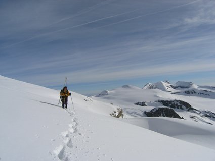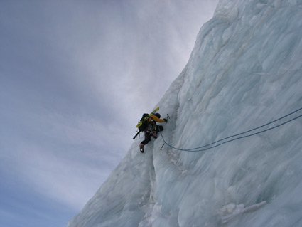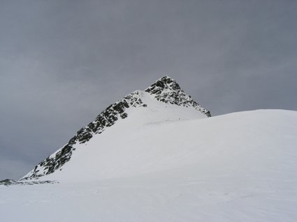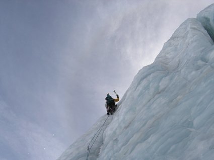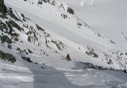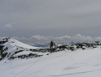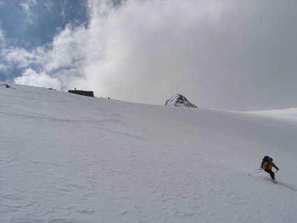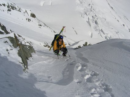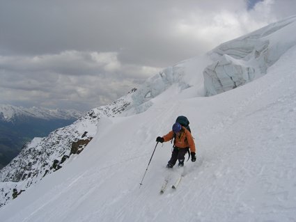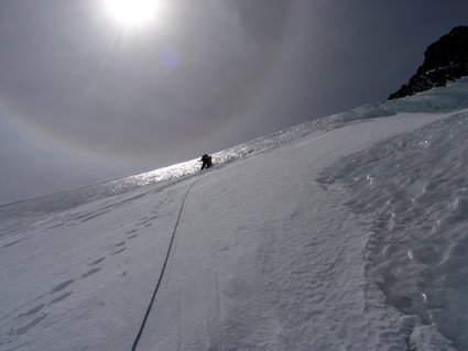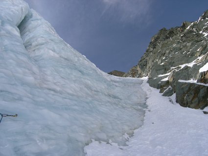 Steiler Firn bis 60° und am Schluß noch ein fast senkrechter Eisbuckel (den man aber auch rechts umgehen kann; 60°). Die untere Rampe ist nur bei aussreichend Firn machbar!