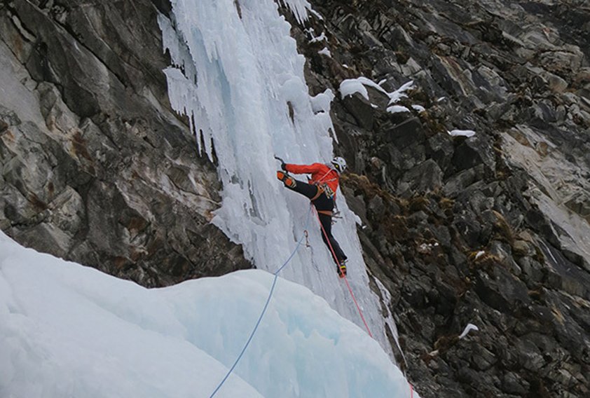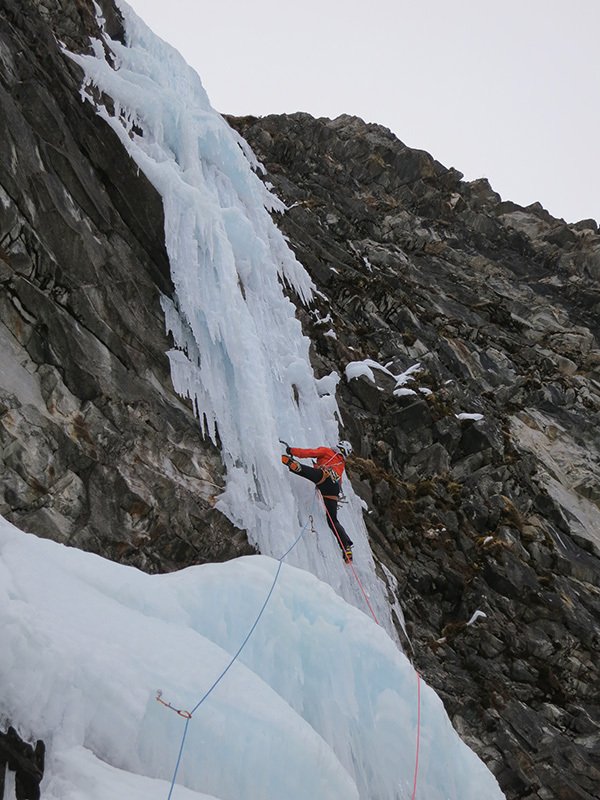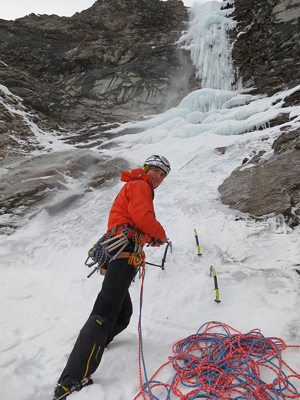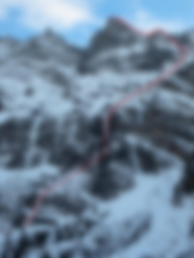 Die Route stellte sich als Kombination aus Nordwand Route mit steilen Schnee und Mixedpassagen (M5) und längeren, senkrechten Eiszapfen bis WI 6 heraus. Vor allem die steile, spinnenartige Eislänge am Ende des ersten Drittels biete Eiskletterei vom Feinsten und in Kombination mit den Teilen danach und davor eine schöne lange alpine Linie!