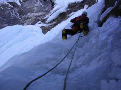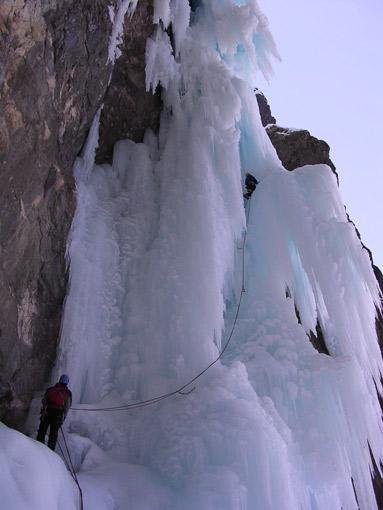 3.SL: WI5+/6-; Querung nach rechts um`s Eck und durch die steile Rinne (leichter Überhang) zum Stand, 25m