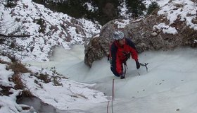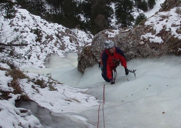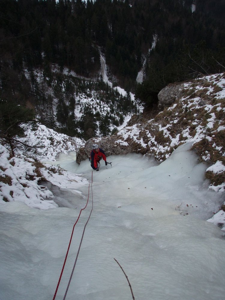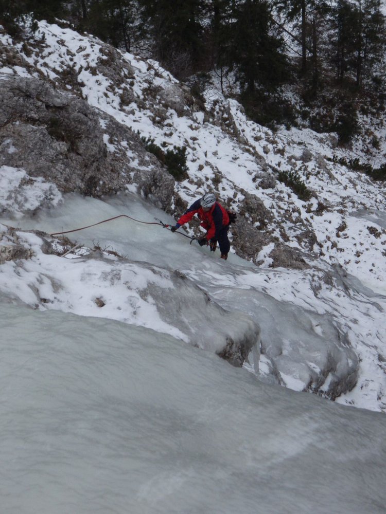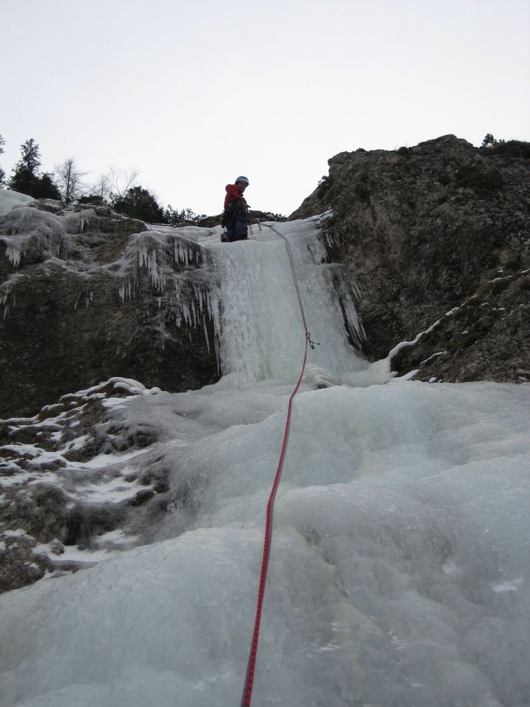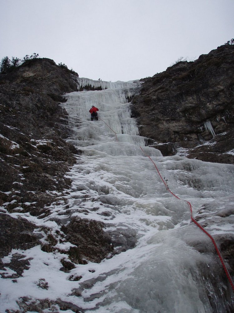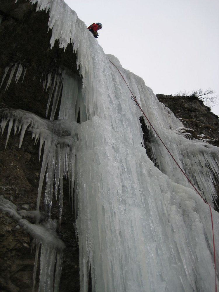 Langer und nur nach längeren Kälteperioden wachsender Eisfall unter dem Sparber bei Strobl. In der 3. SL sind 2 Varianten möglich, wobei die rechte nach einer kurzen steileren Stufe leichter ist.