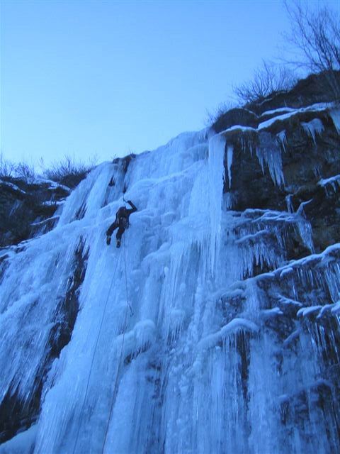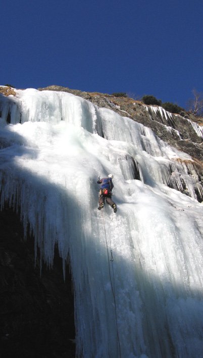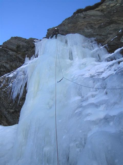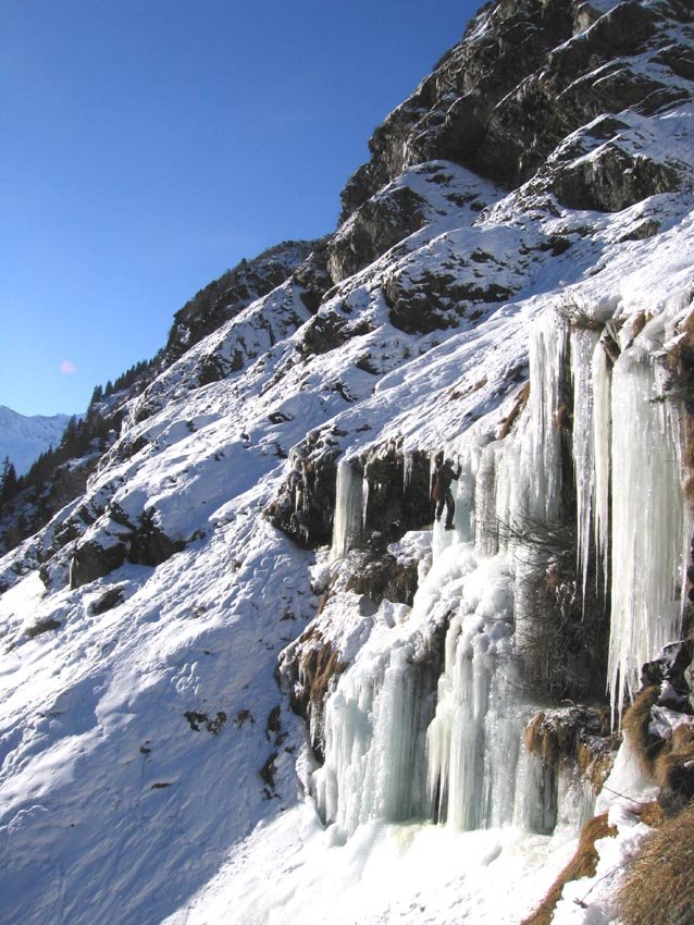 In der ersten Seillänge ist zwingend der 5.Grad zu klettern, die man jedoch links über einen weiten Bogen umgehen könnte. Im oberen Teil des Eisfalles kann man sich je nach Lust und Laune eine leichtere oder auch schwierigere Linie aussuchen.