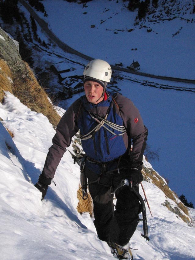 Schöner langer Eisfall mit Gehgelände, der von unten leichter aussieht, als er dann wirklich ist. Am besten bei wenig Schnee und sicher Lawinensituation!