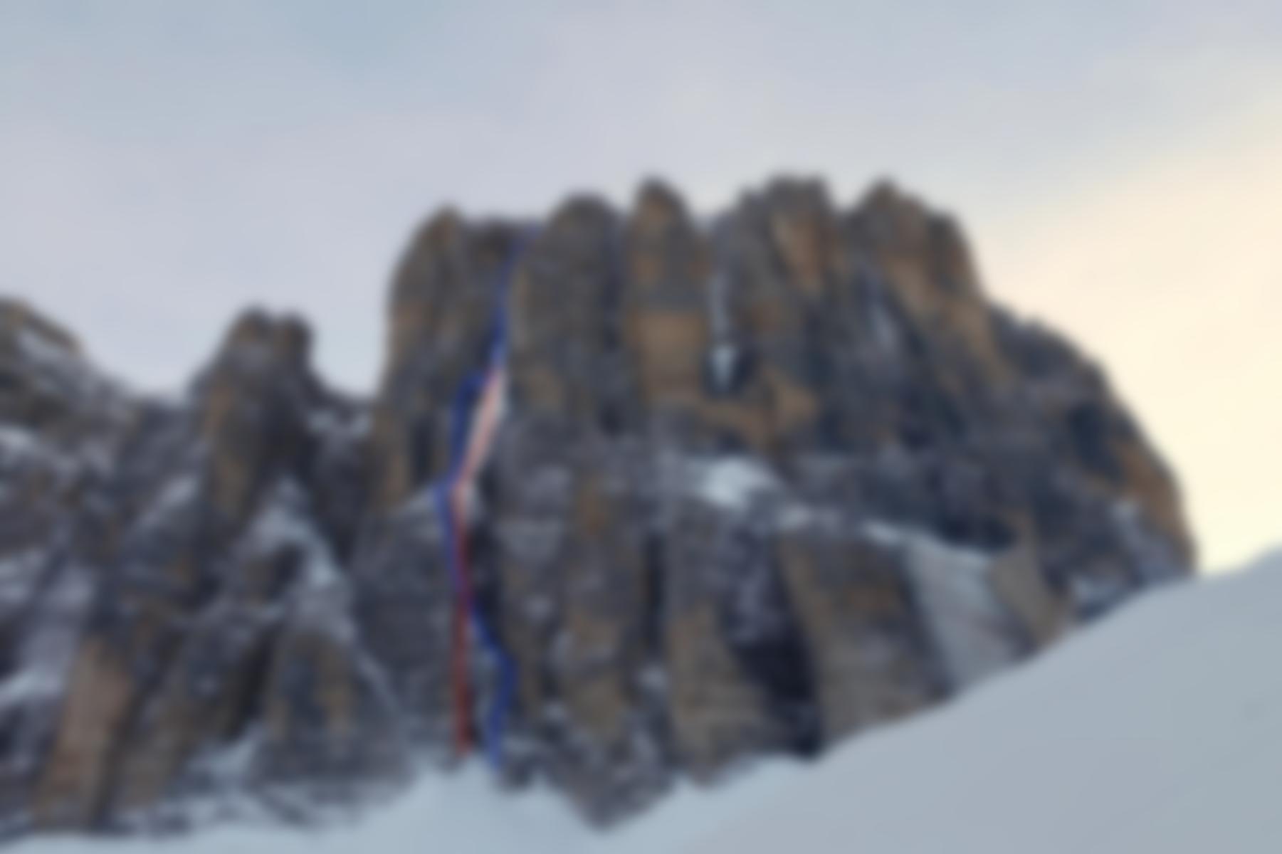Am 1.1.2019 kletterten Ines Papert und Luka Lindič einen direkten (im Topo rot) Weg zum Gipfel, der mehr im schwierig abzusicherenden Eis verläuft. Einen Bericht mit mehr Bildern über diese Begehung findet ihr bei uns hier