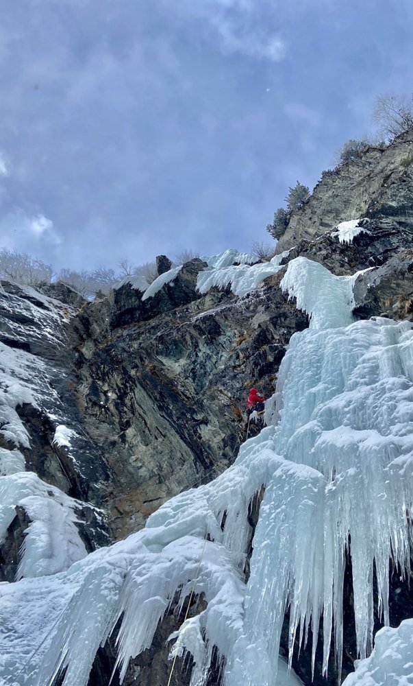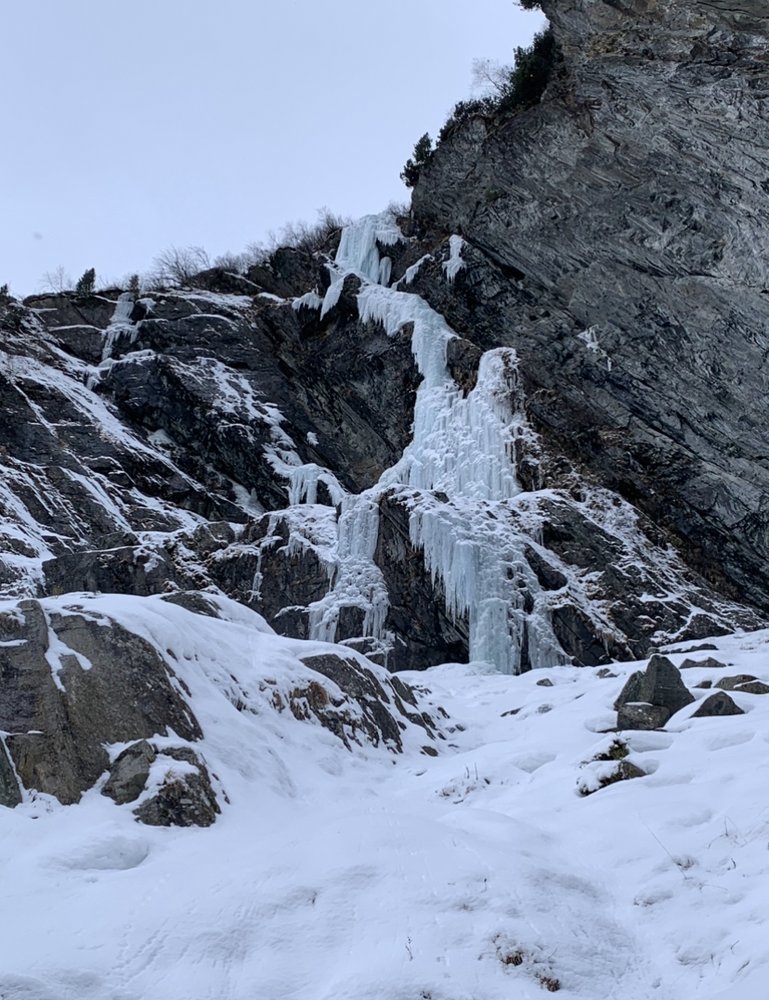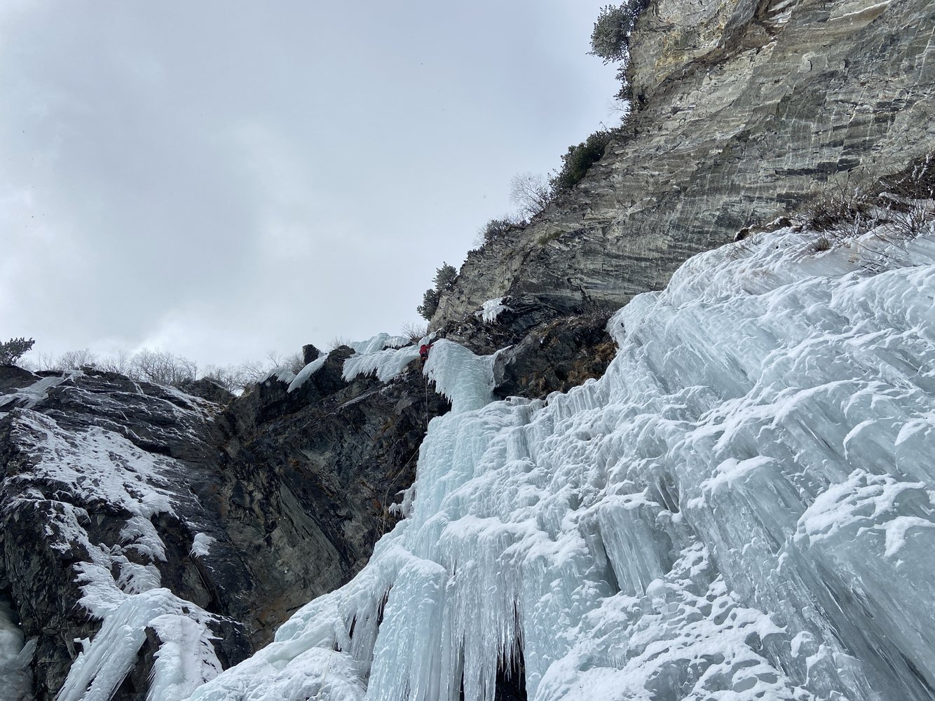 1.SL ist mit 2 Bohrhaken (Eis ist sehr dünn). Stand ist gerade nach oben bei einem Stein. Achtung nicht unter den Vorhängen Stand machen wegen Eisschlag!!! (2 Bohrhacken, 50m)