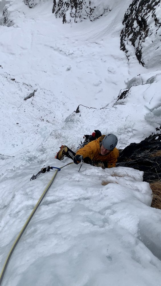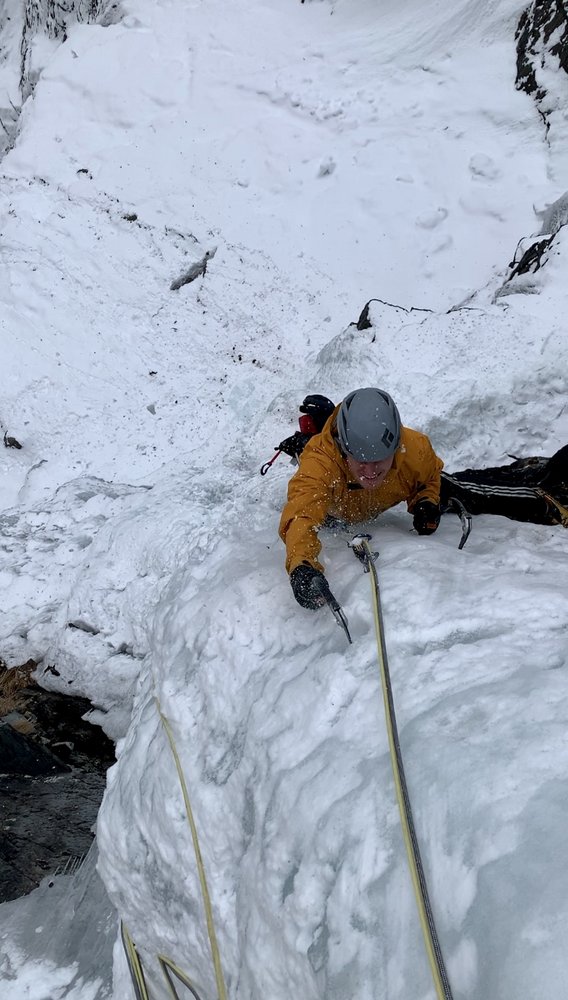 2.SL geht über die linke Eisrampe und dann leicht rechts in den Felsteil. (3Bohrhaken, 2 Schlaghacken,30m)