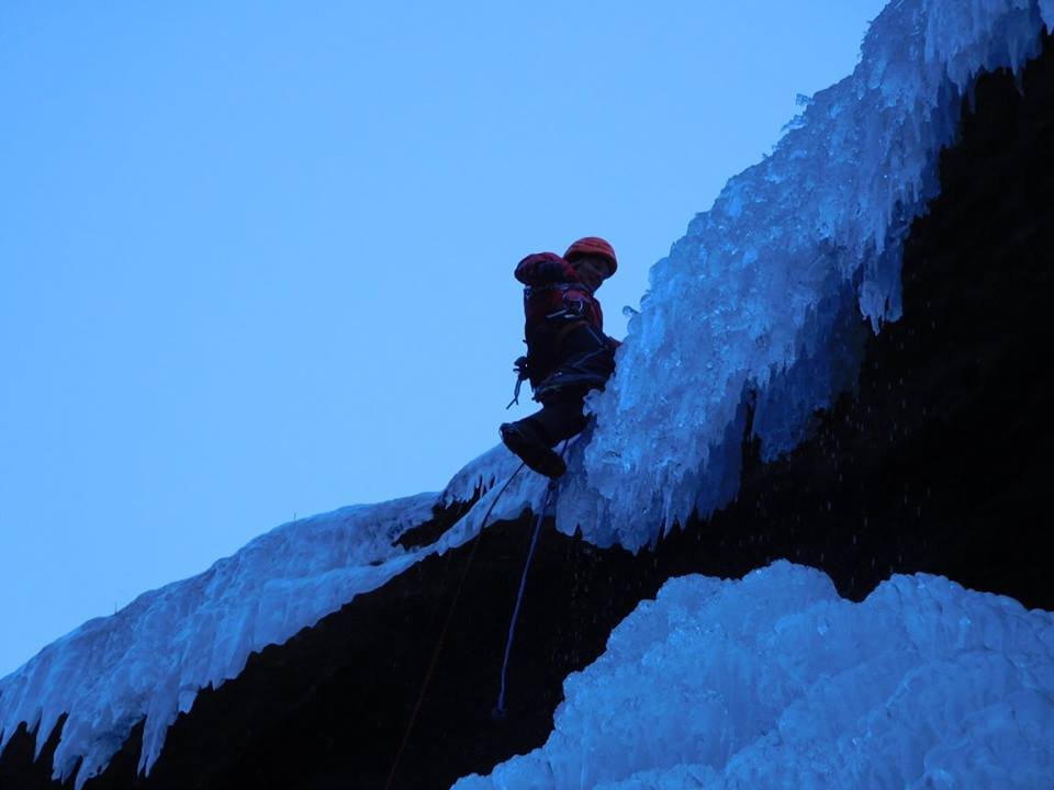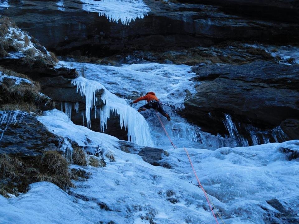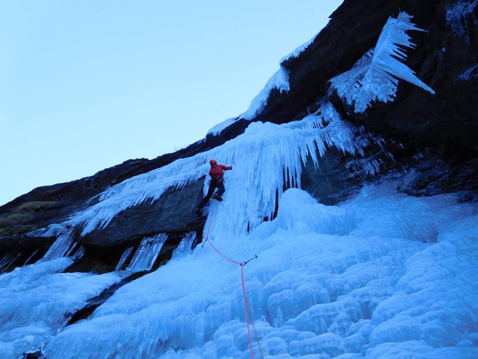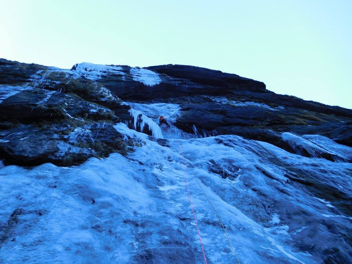 1.Sl…(kann umgangen werden)…Vom Depot über Glasur zur Steilstufe, über diese und dann nur leicht ansteigend über die Rampe (teils dünn) zur Ecke auf dem großem Band und zum Eisstand (60 m!!!, WI3+, kurze Schrauben!).