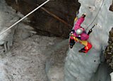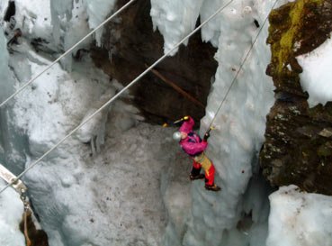 Eine der beliebtesten Möglichkeiten in der Klamm, gleich bei der Brücke (an der auch gesichert wird). Auch deshalb so beliebt, weil er sehr gut eingesehen werden kann und somit die Verhältnisse meist sofort klar sind. Unten über Säule, die gegen oben hin etwas breiter wird.