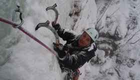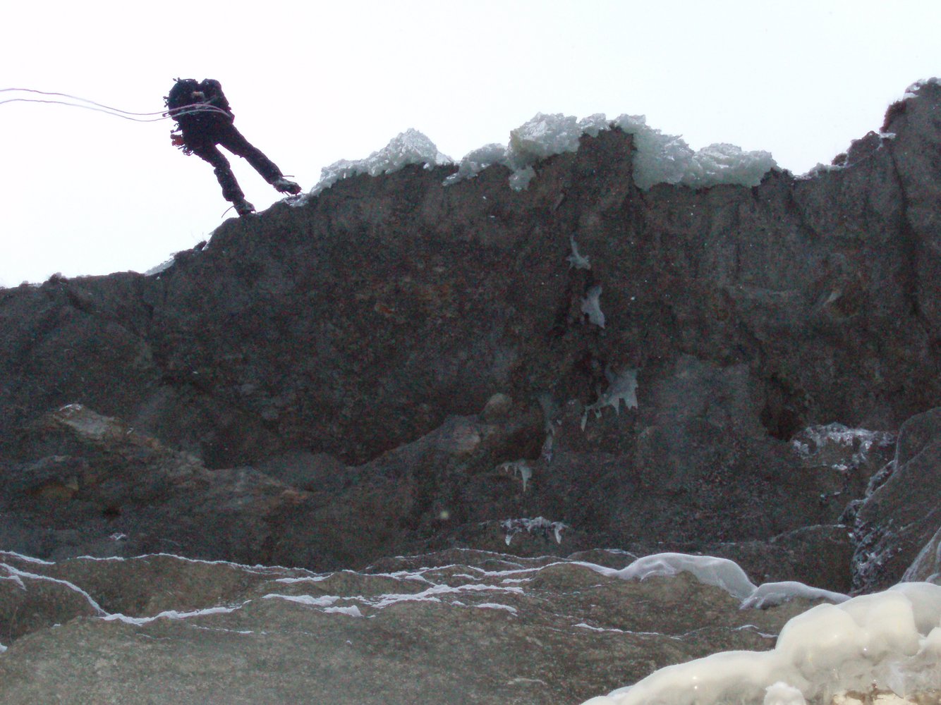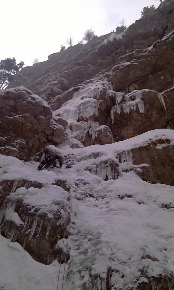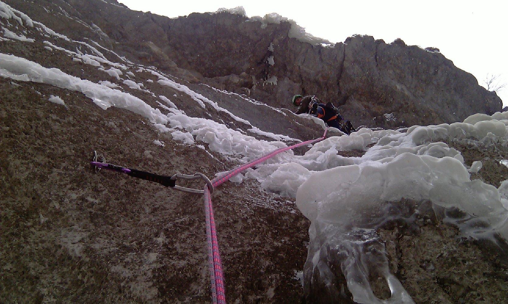 Im Mittelteil zwei Seillängen Fels bzw. Mixedkletterei mit knackigem Abschlussüberhang, der wieder ins Eis leitet. Sehr wenig Möglichkeiten zusätzliche Sicherungen im Fels anzubringen.
