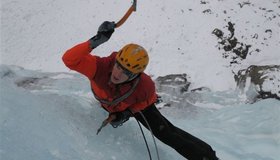 Route im linken Teil der Renkfälle - die obere Säule ist in der Regel sehr nass, deshalb haben die Erstbegeher die Route auch „Dampfstrahler“ genannt.