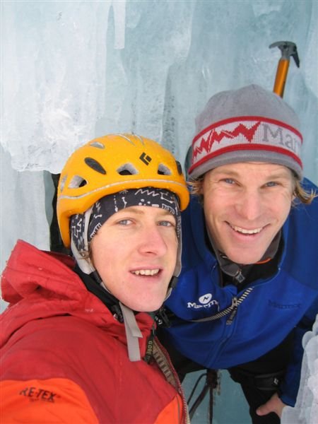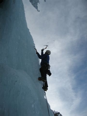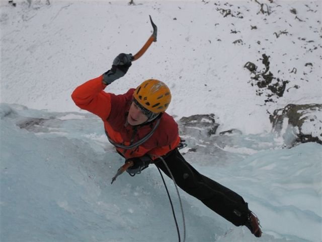 Route im linken Teil der Renkfälle - die obere Säule ist in der Regel sehr nass, deshalb haben die Erstbegeher die Route auch „Dampfstrahler“ genannt.
