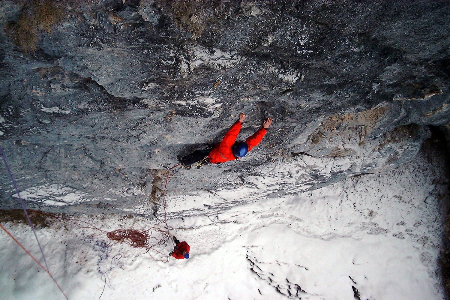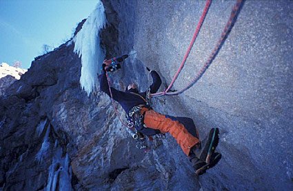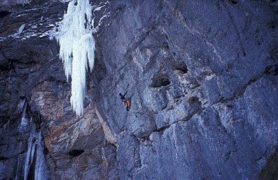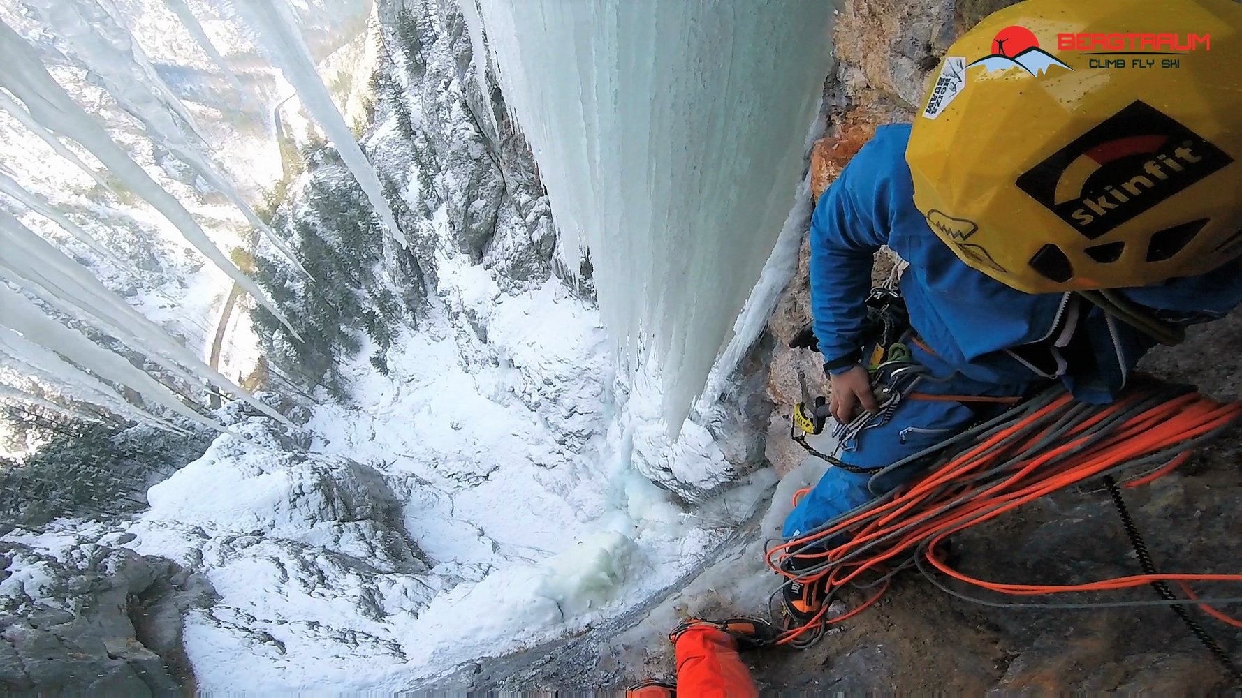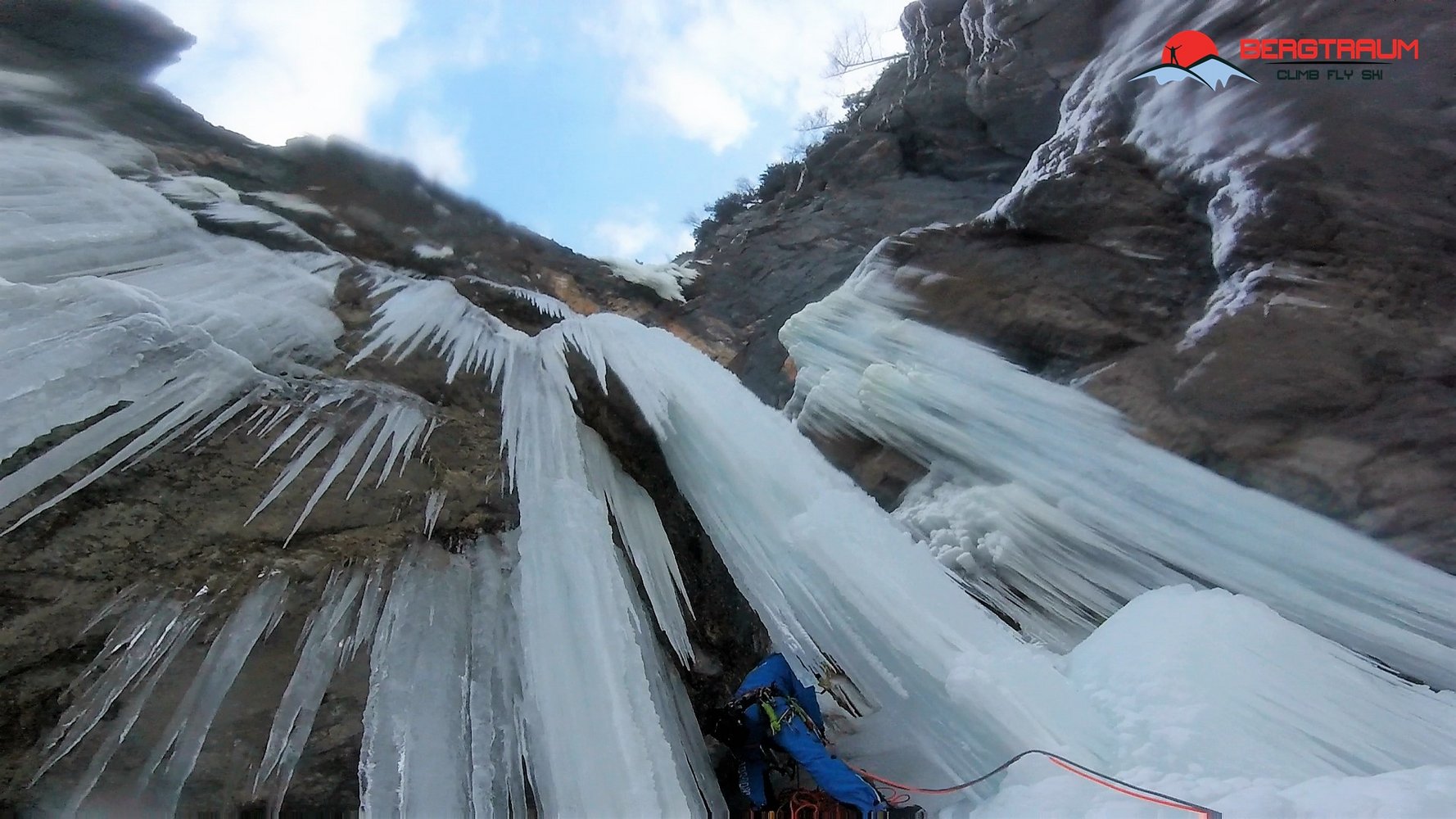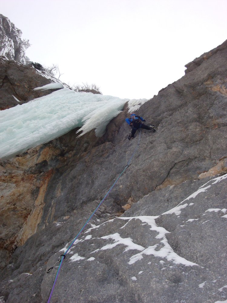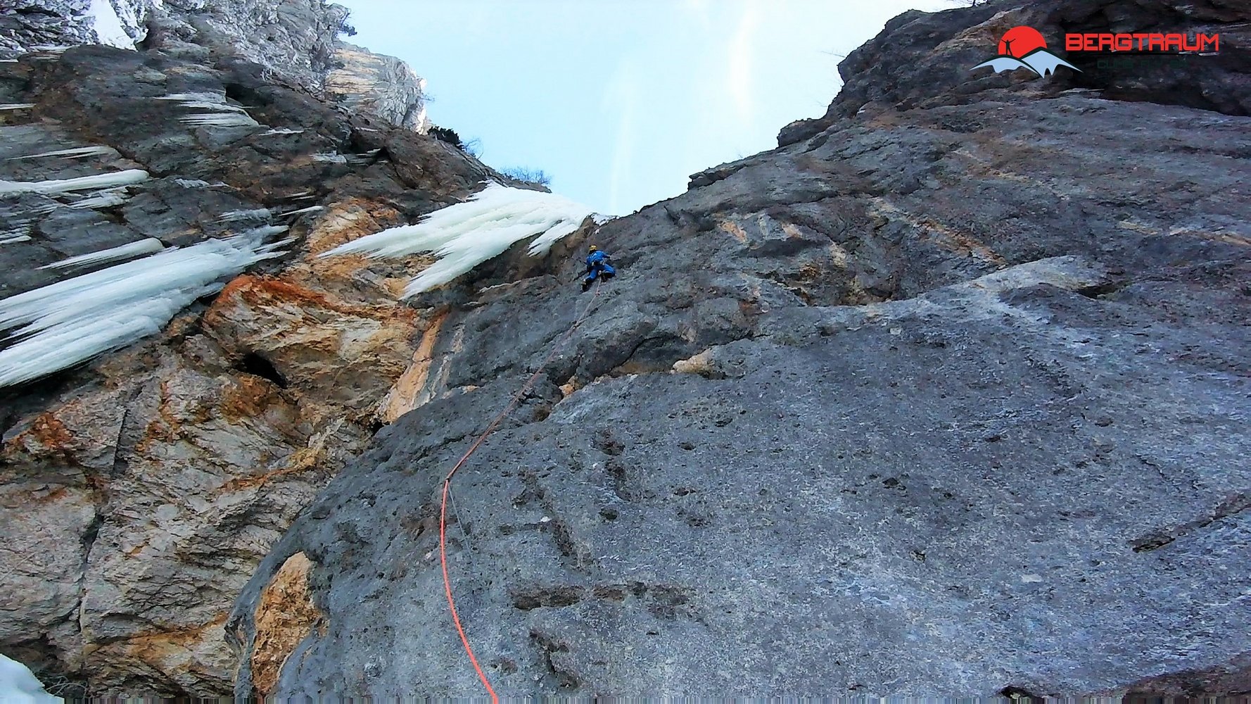 Die Schlüsselseillänge (8.Sl.) kann auch bei wenig Eis bewältigt werden. Bedingt durch die Steilheit kann ohnehin nur knapp an der Wurzel des freien Zapfens auf das Eis übergesetzt werden.
