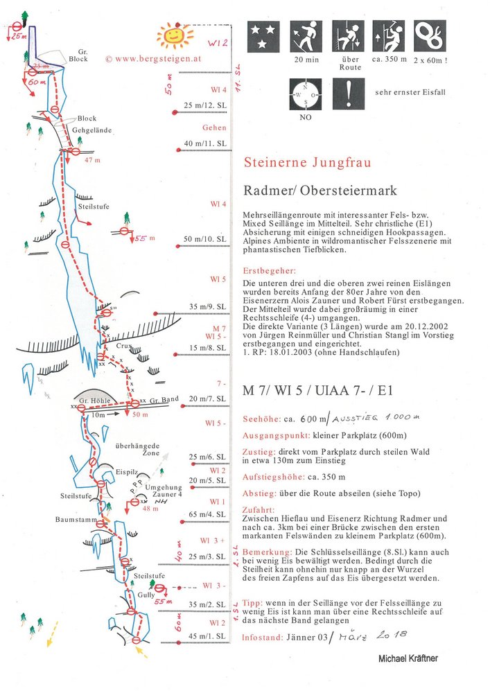 Vorsicht: Sollte die Säule in der 7. und 8. Seillänge ganz bis nach unten durchgewachsen sein, ist die reine Eisbegehung mit Risiken verbunden. Mehr dazu unter Deflorierung der Steinernen Jungfrau.
