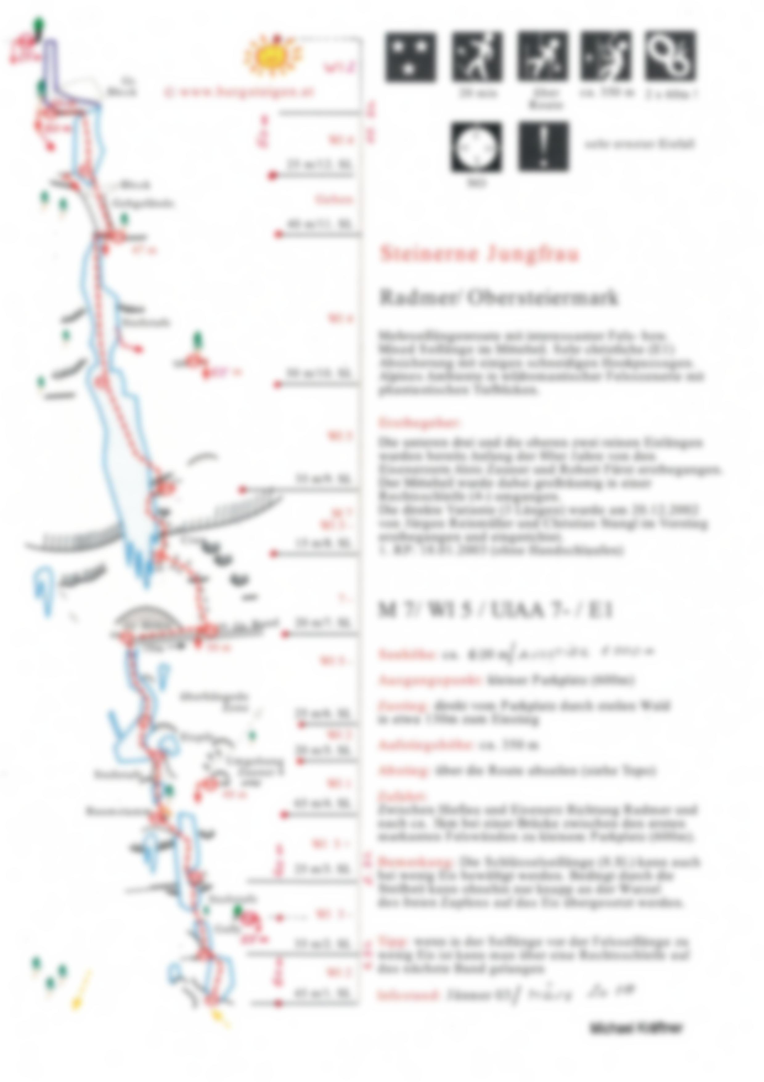 Mehrseillängenroute mit interessanter Fels- bzw. Mixed Seillänge im Mittelteil. Sehr christliche (E2) Absicherung (Vorsicht in den M7 Länge nach dem 1. BH) mit einigen schneidigen Hookpassagen. Alpines Ambiente in wildromantischer Felsszenerie mitphantastischen Tiefblicken.