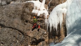 Mixed Kletterei (1. SL) am linken Eisfall des Gindlhorn auf den ersten Absatz. Von dort weitere Möglichkeiten (links Eis, Mitte einige Mixed-Routen, rechter Fall "Psychokiller" - siehe Eiskletterführer.