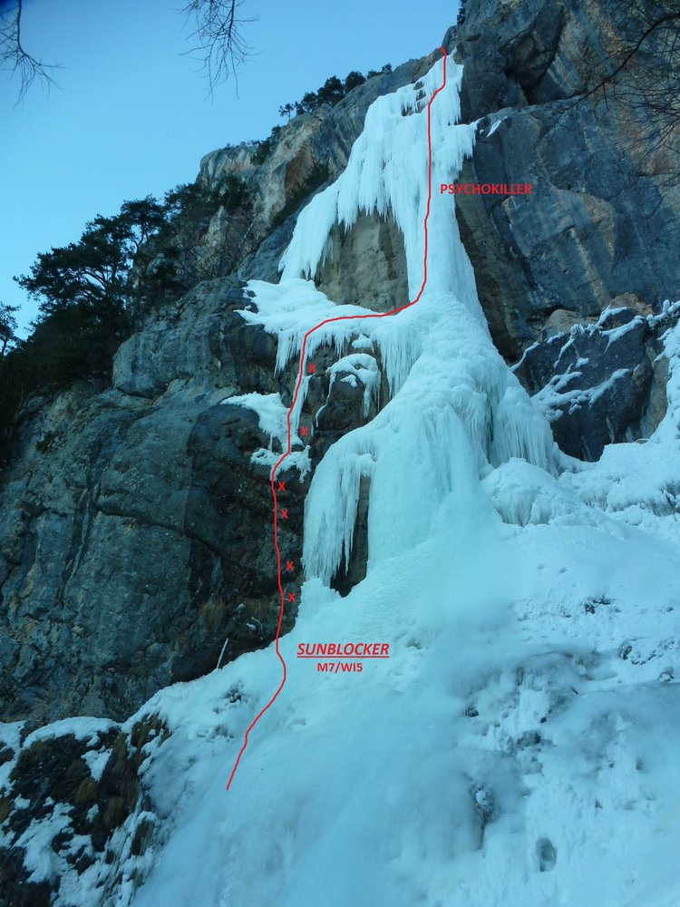 Links vom linken Eisfall, erst über Fels dann Eis bzw Mixed weiter auf den ersten Absatz.