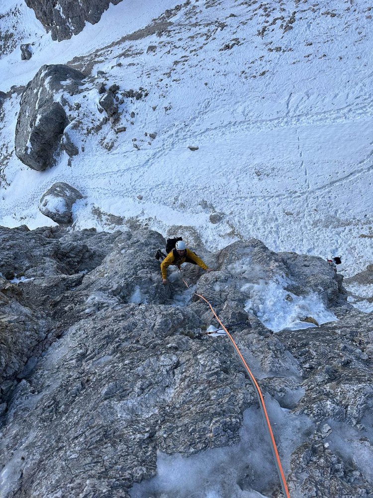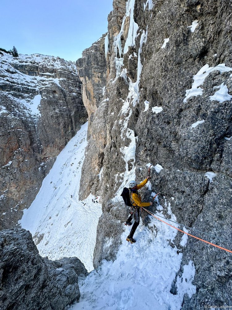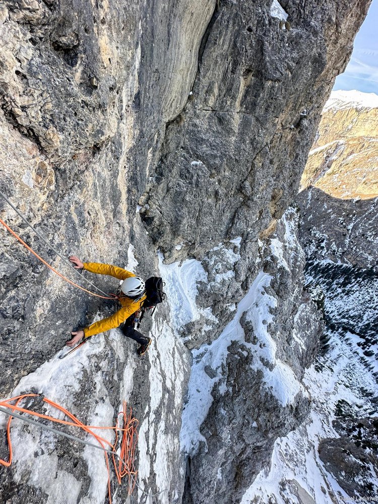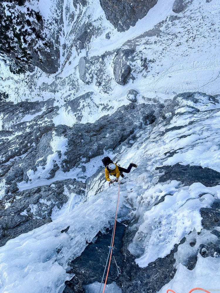 Der Verschneidung folgen bis in ein Schneefeld, dann nach links über einen waagrechten Riss zum Eis 60 m M6+