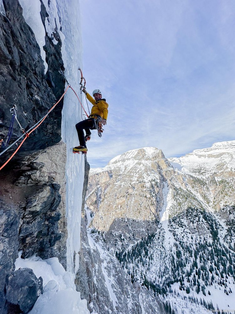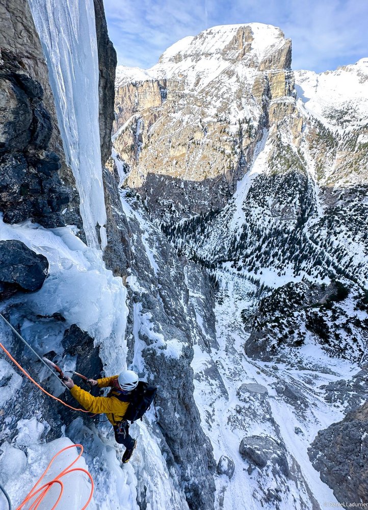 2 kurze kräftige Züge um auf den Eiszapfen zu gelangen und übers Eis bis zum großen Band. 50 m M7 WI5+ (Darüber am Band je nach Verhältnissen noch eine Seillänge möglich Wi4+ 50 m)