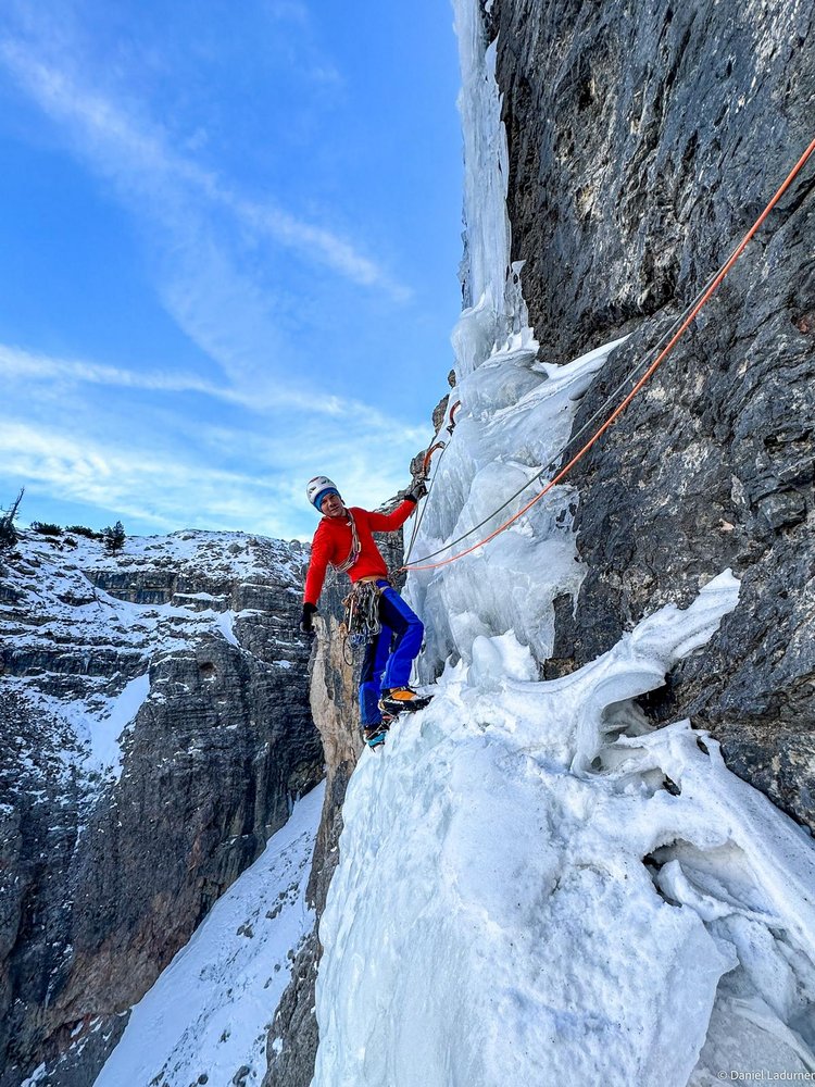 Bericht: Schon früh in der Saison entdeckte ich mit Hannes diese Linie, jedoch vergingen einige Wochen bis wir uns motivierten, mit schweren Rucksäcken zum Einstieg zu marschieren. Wir richteten die Route Großteiles mit Schlaghaken ein und verwendeten nur wenige Bohrhaken.