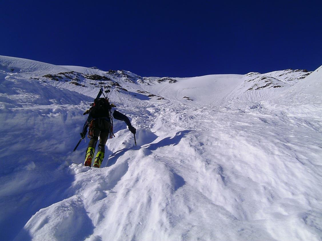 Vom Parkplatz in Mittelberg (bei Seilbahn) auf Straße durch das Taschachtal bis zur Materialseilbahn und von dort auf Weg zurm Taschachhaus (mit MTB ideal!). Das Taschachhaus liegt auf 2432 m. Von dort kurz über den Rimlsteig auf den Taschachferner und zur Einstiegsrinne.