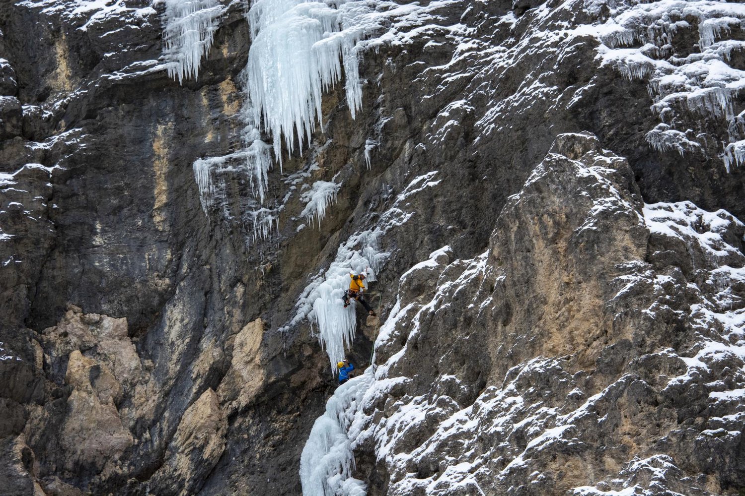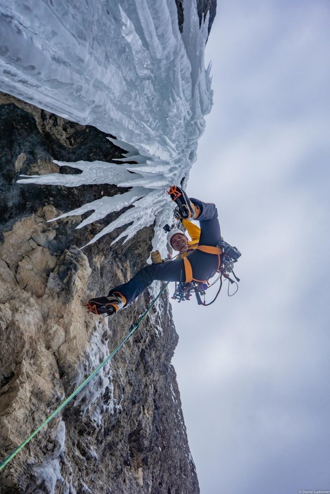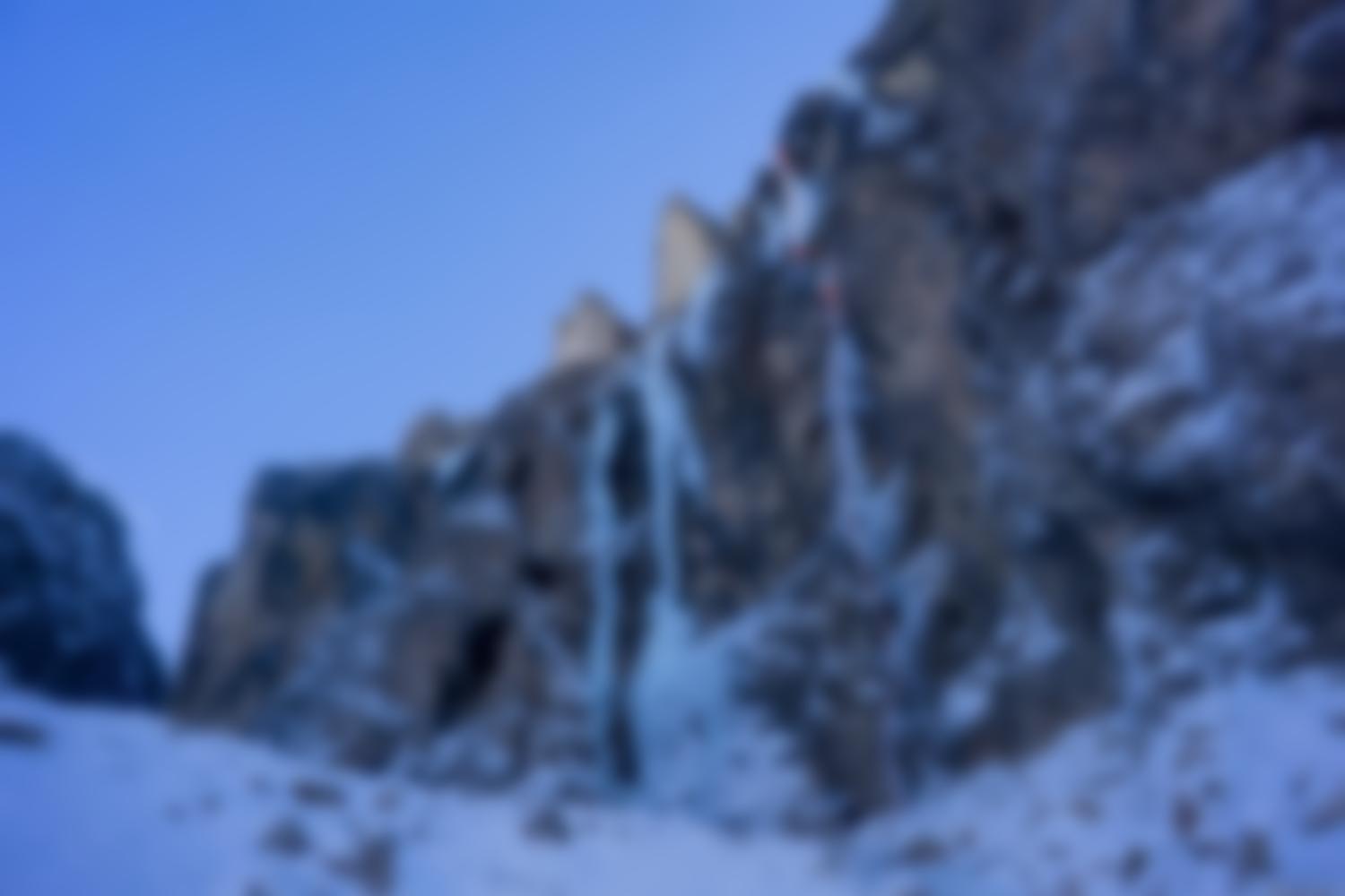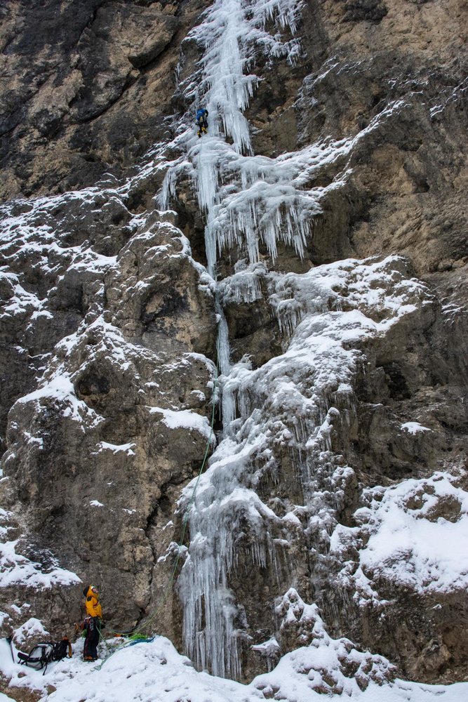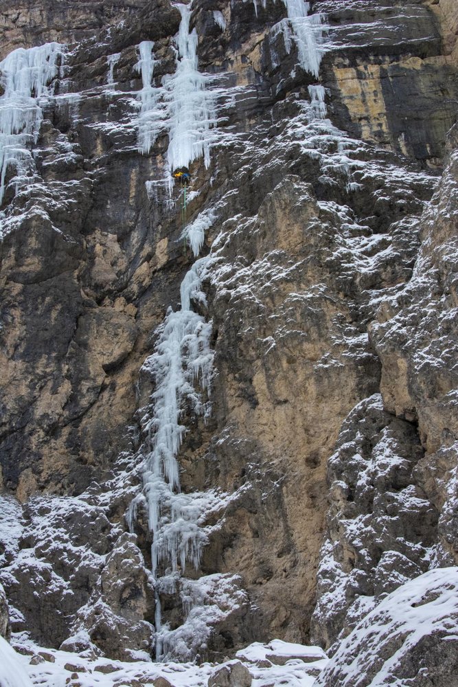Nachdem Hannes und ich einige Tage zuvor die Route „Airport“ Erstbegangen hatten, viel mir beim Zustieg diese Linie auf. Hannes war logischerweise sofort mit von der Partie, sowie Ivan Goller, ein Grödner Fotograf der das ganze Fotografisch festhalten wollte. So starteten wir mit dem E-Bike gemütlich das Langental hinein und wanderten bis zum Einstieg unter dem Piovra Wasserfall. Hannes kletterte die Erste Seillänge und ich schleppte das restliche material für die Mixedseillänge die uns erwartete nach. Mich traf es dann den Neuland Mixedteil zu klettern und mit Bohrhaken abzusichern, das aufgrund des eher brüchigen Felses nicht so einfach war. Irgendwie kämpfte ich mit nach oben und setzte einige Bolts immer aus der Kletterposition. Nachdem ich unter dem Eisvorhang einen Standplatz einrichtetet kam Hannes nach. Er durfte wieder die letzte Seillänge die zum Schluss über eine ca. 10 freihängende Eiskerze führt klettern. Diese Kerze kann aber geschickt im guten Eis dahinter abgesichert werden muss nicht voll belastet werden. Die Kletterei schaut aber von unten schlimmer aus als sie dann in wirklichkeit ist da man schön zwischen den Eispilzen am Fels und der Kerze spreizen kann.