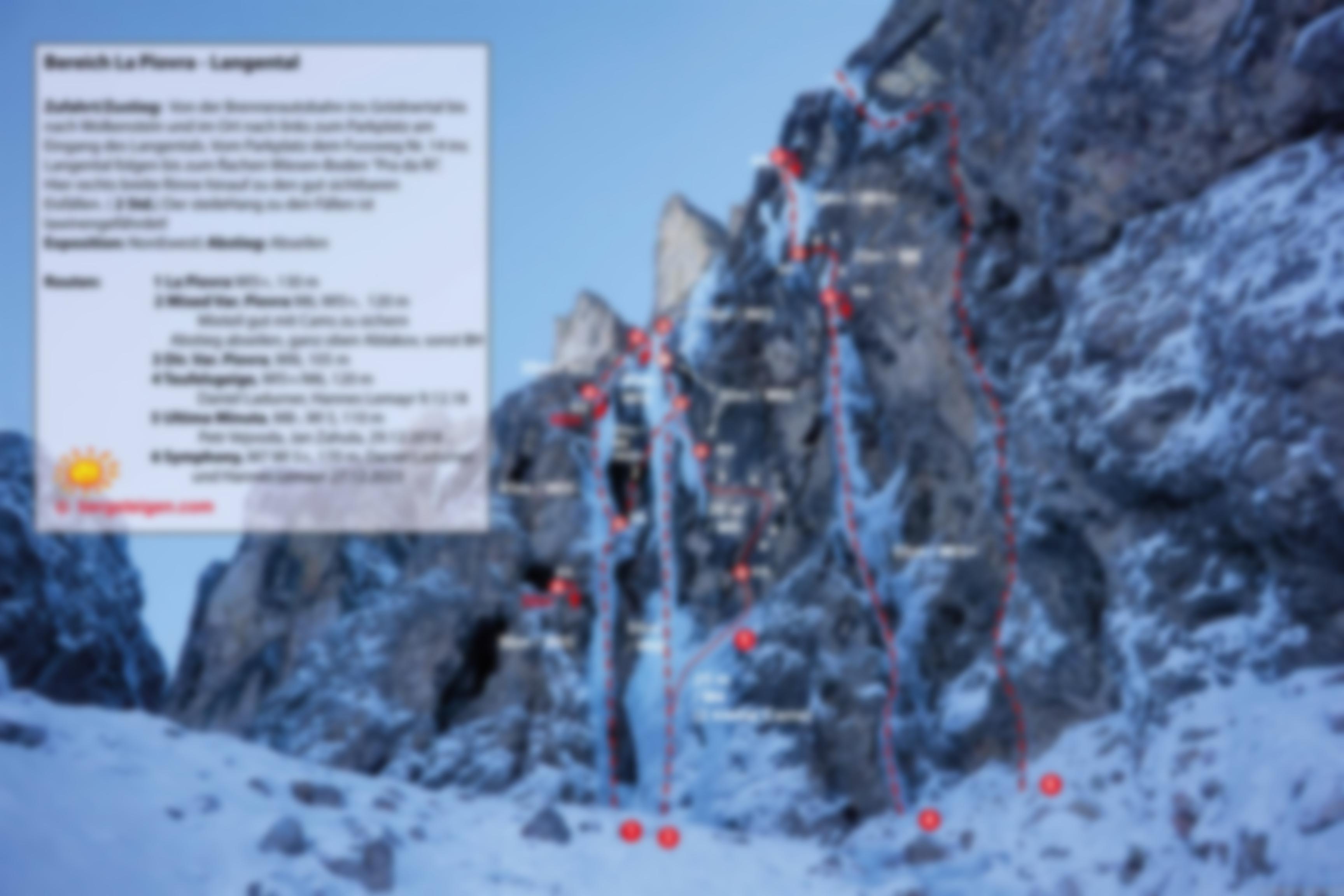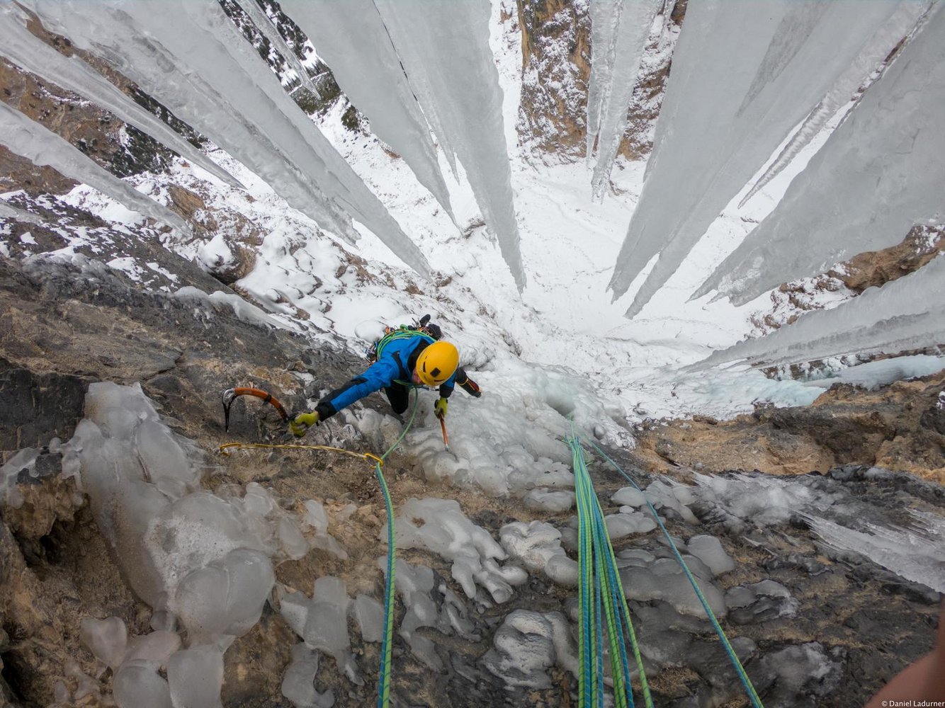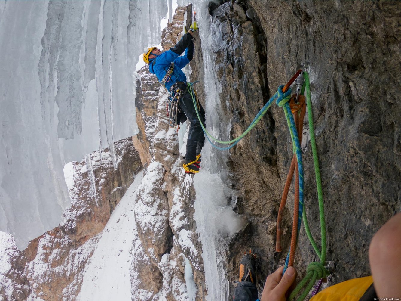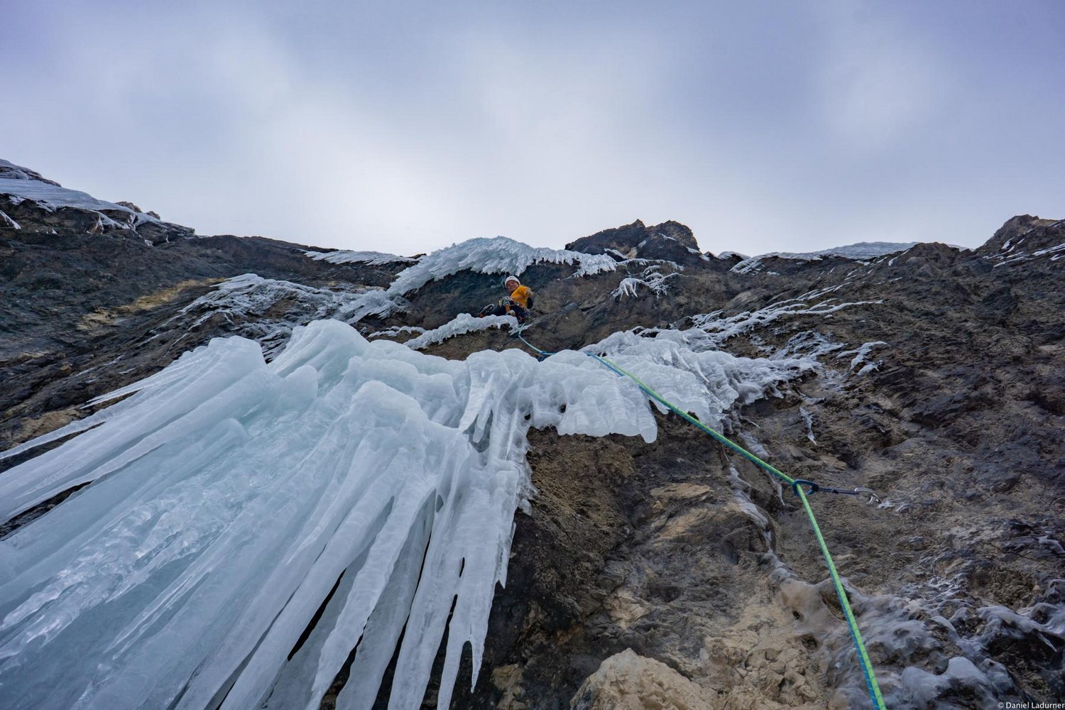 Nachdem Hannes und ich einige Tage zuvor die Route „Airport“ Erstbegangen hatten, viel mir beim Zustieg diese Linie auf. Hannes war logischerweise sofort mit von der Partie, sowie Ivan Goller, ein Grödner Fotograf der das ganze Fotografisch festhalten wollte. So starteten wir mit dem E-Bike gemütlich das Langental hinein und wanderten bis zum Einstieg unter dem Piovra Wasserfall. Hannes kletterte die Erste Seillänge und ich schleppte das restliche material für die Mixedseillänge die uns erwartete nach. Mich traf es dann den Neuland Mixedteil zu klettern und mit Bohrhaken abzusichern, das aufgrund des eher brüchigen Felses nicht so einfach war. Irgendwie kämpfte ich mit nach oben und setzte einige Bolts immer aus der Kletterposition. Nachdem ich unter dem Eisvorhang einen Standplatz einrichtetet kam Hannes nach. Er durfte wieder die letzte Seillänge die zum Schluss über eine ca. 10 freihängende Eiskerze führt klettern. Diese Kerze kann aber geschickt im guten Eis dahinter abgesichert werden muss nicht voll belastet werden. Die Kletterei schaut aber von unten schlimmer aus als sie dann in wirklichkeit ist da man schön zwischen den Eispilzen am Fels und der Kerze spreizen kann.