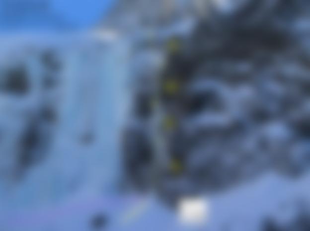 Steile Eiskletterroute mit Mixtaustieg. Die Schüsselstelle befindet sich in der 3. Seillänge (freistehende Säule) und in der 5. Seillänge (Mixtgelände).