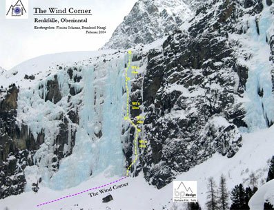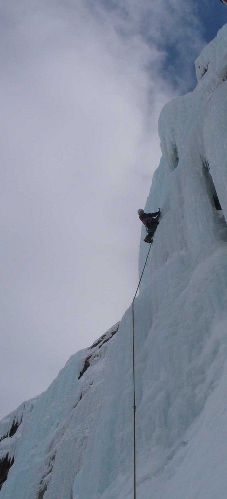 Steile Eiskletteroute, die erste Seillänge hat nur eine dünne Eisauflage, der Eistieg befindet sich ca. 50m li. der Route "Teufelskralle" bzw. etwas rechts vom zentralen Teil der Renkfälle.