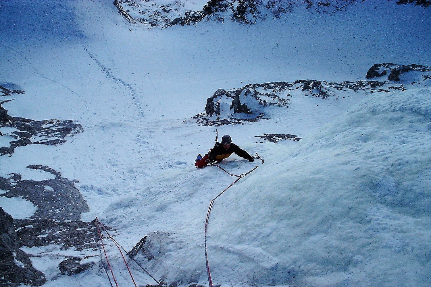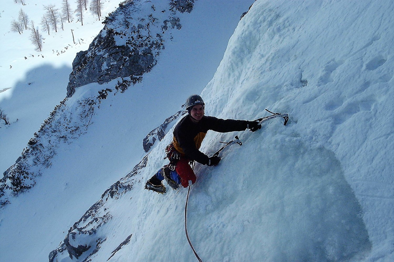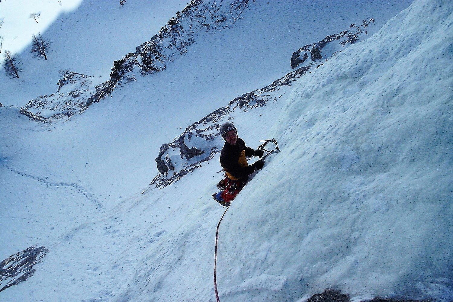 Netter und gut eingerichteter Übungsfall, der meist kompaktes Eis aufweist. Der Zustieg ist zwar für die knapp 30 m `echte` Kletterei etwas lang, dafür ist man aber in einer wunderbaren Gegend mit Blick auf die Hochschwab Südwand. Tourenski für den Zustieg sind unbedingt erforderlich und auf den letzten Metern sollte man auch auf die Lawinengefahr achten. Der Fall ist durch seine hohe u. nordseitige Lage auch später im Jahr machbar.
