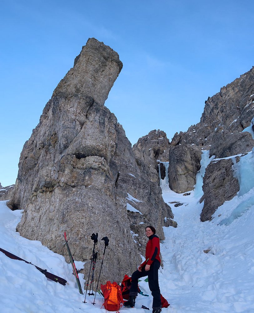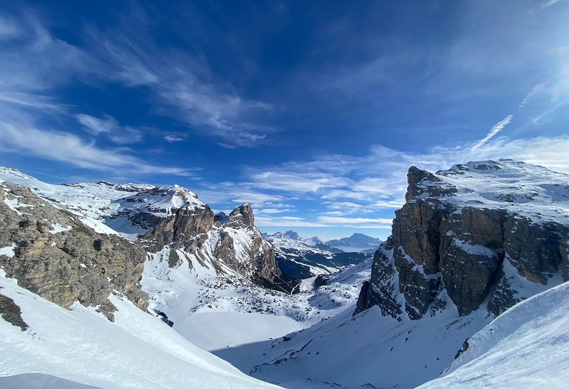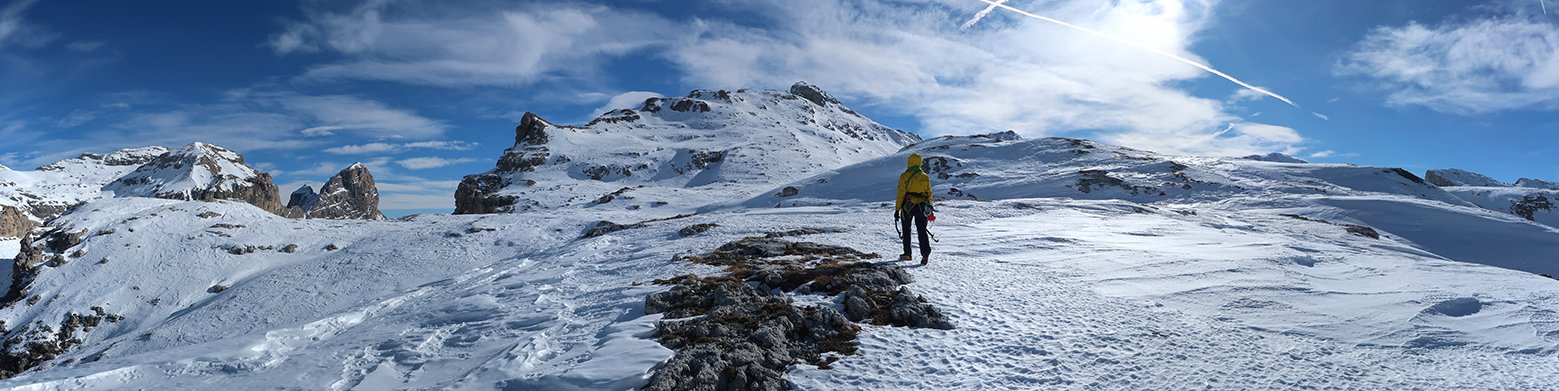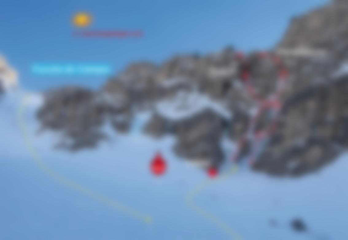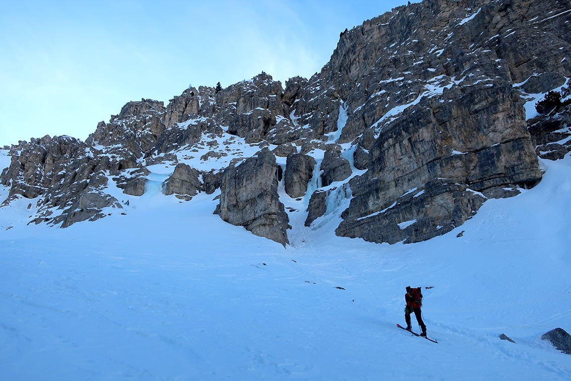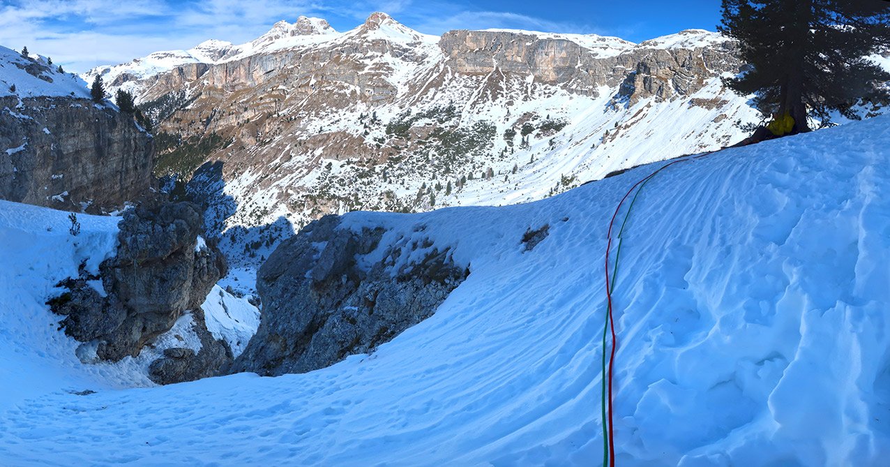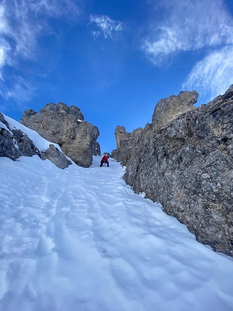 Nur bei sicheren Schneeverhältnissen aufsteigen. Der Fußabstieg hinauf zum Plateau und zur Furcela de Ciampei ist möglich, aber auch bei guten Schneeverhältnissen mühsam (Strecke ist weiter als es den Anschein hat).