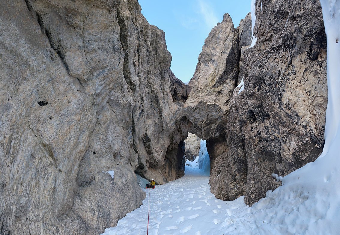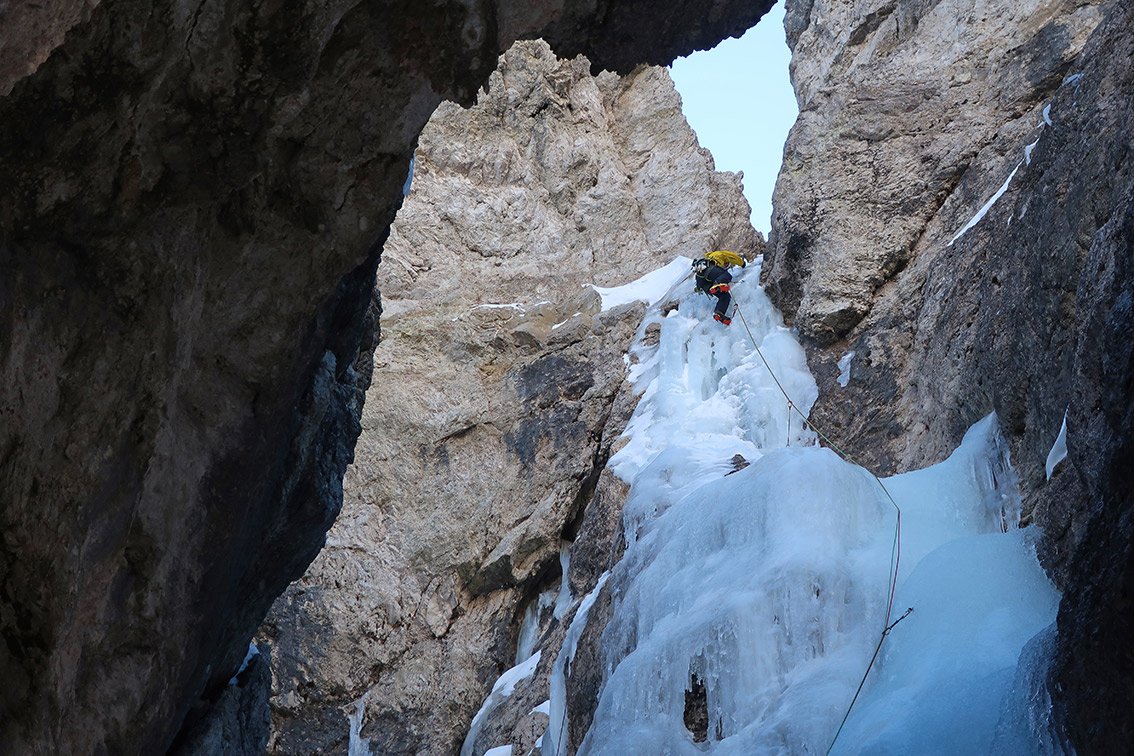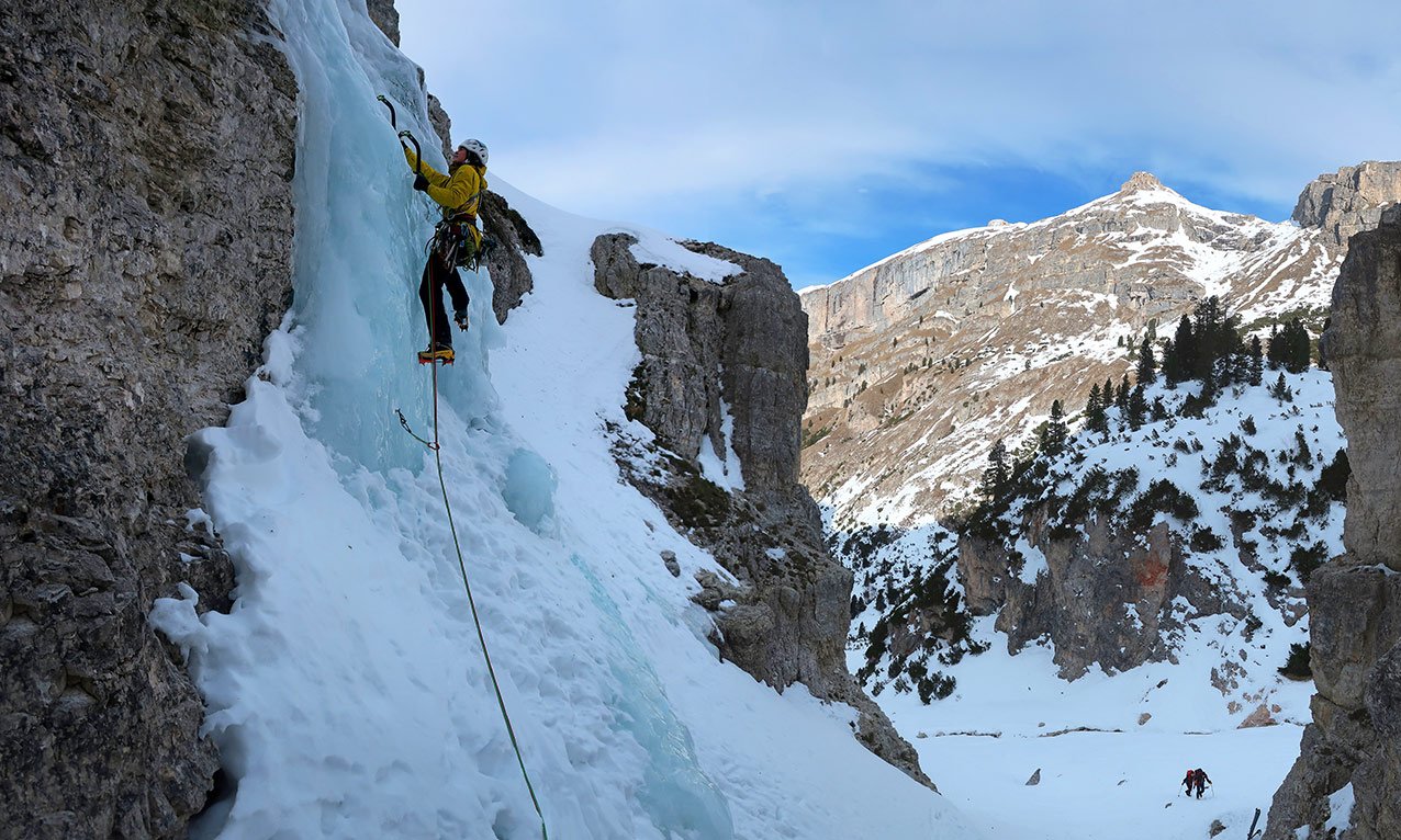 Der Tunnel und die Perla Azurra gehören zu den leichtesten Anstiegen im Eisklettermekka Langental bei Wolkenstein. Die Routen befinden sich ganz hinten im Tal, haben meist passable Eisverhältnisse, sind deshalb recht beliebt und gut besucht. Vor allem der "Tunnel" ist spektakulär, da man in einer kleinen Schlucht unterhalb eines riesigen Klemmblocks hindurchklettert. Die "Perla Azurra" ist quasi die steile, tolle Eisseillänge, welche man direkt bei der Abzweigung zum "Tunnel" gerade hinauf machen kann. Der Rest der Perla Azurra ist je nach Verhältnissen eher Schneestapferei und nur bei wenig Schnee findet man lohnende Eisstufen in der finalen Rinne.