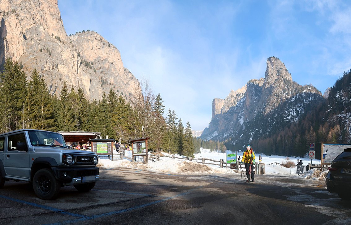 Über die Brennerautobahn bis nach Klausen und weiter ins Gardenatal bis nach Wolkenstein. Am Ortsanfang von Wolkenstein der Straße ins Langental folgen und bis zum gebührenpflichtigen Parkplatz beim Imbisstand fahren (Parkautomat, Ende der Fahrmöglichkeit).