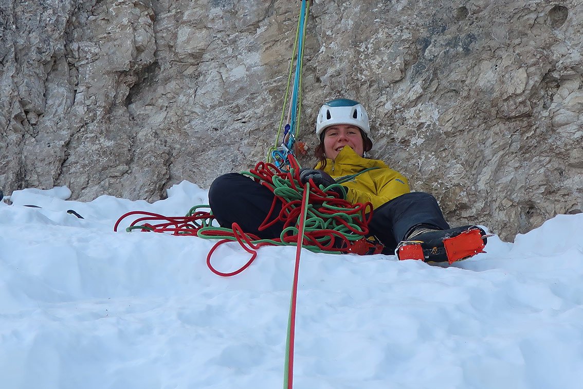 Am besten über die Tour abseilen - Bohrhakenstände und/oder an Abalakov. Bei sehr guten Verhältnissen kann man oben eher rechts haltend zur Hochfläche aufsteigen und dann nach links zur Ciampei Scharte gehen (sichere Schneeverhältnisse nötlig). Dann von der Ciampei Scharte die oben steile Rinne wieder zum Einstieg absteigen (gesamt deutlich mühsamer und länger als das Abseilen über die Tour!).
