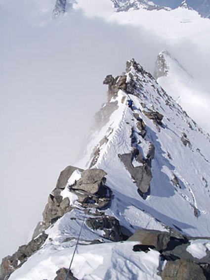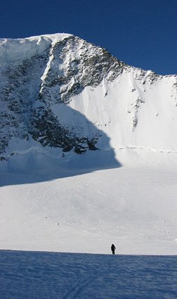 Zuerst über den Bergschrund (meist das größte Problem der Firnwand), dann auf den Nordgrat (Fels bis III+ und Firn) und diesem bis zum Gipfel folgen.