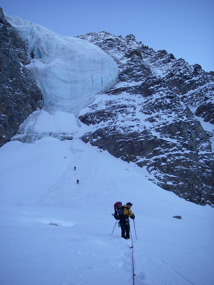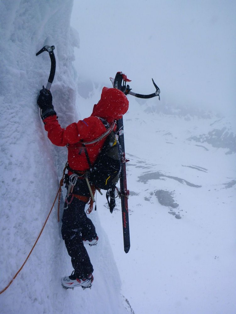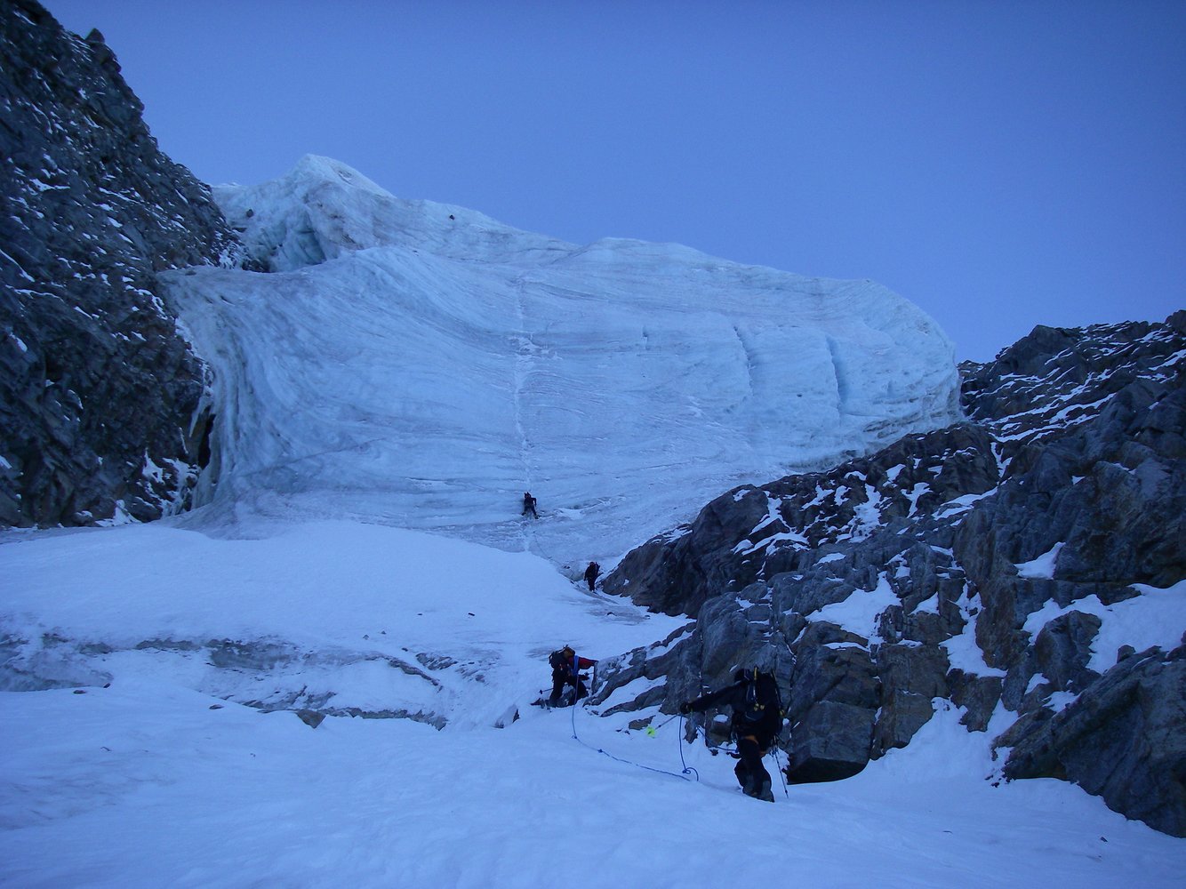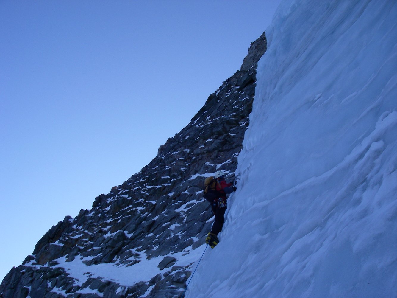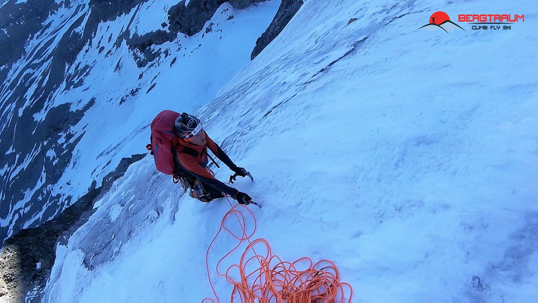 Firn bzw. Eis bis 80° (Var. links auch steiler) - Hochalpine steile Eistour, kompl. Eisausrüstung und Seil sind erforderlich. Auch der Abstieg ist äußerst anspruchsvoll - brüchiges Blockgelände.