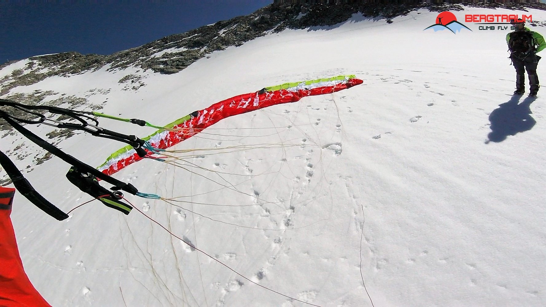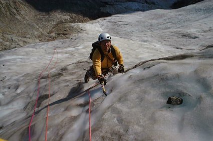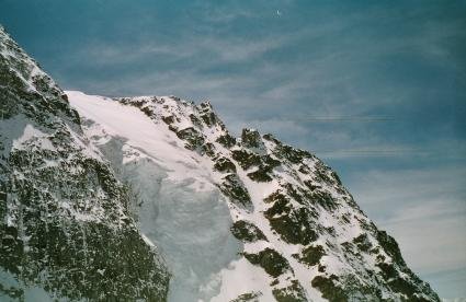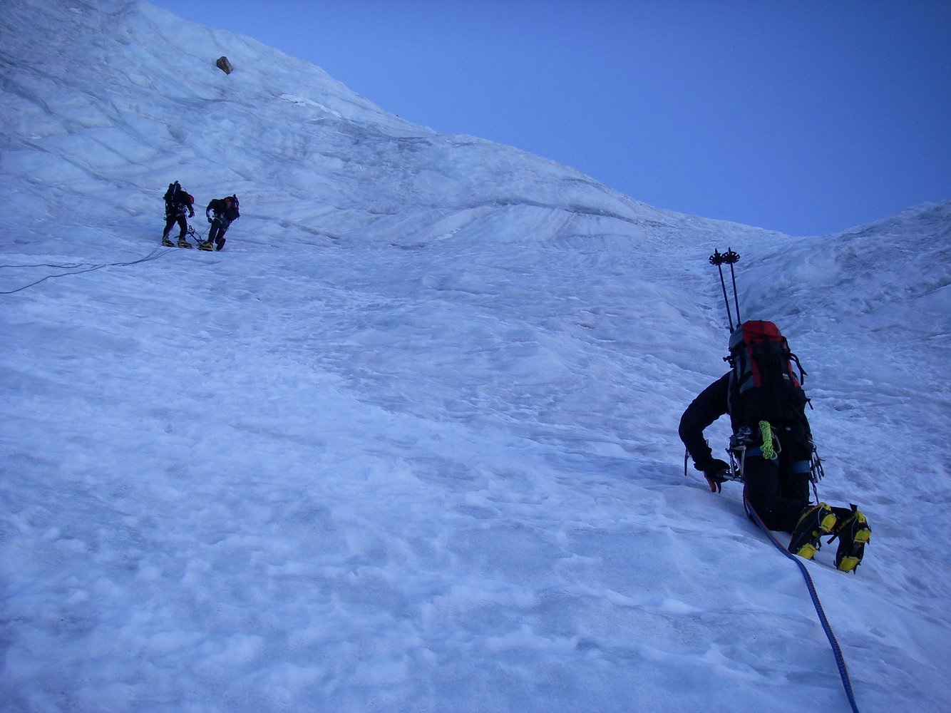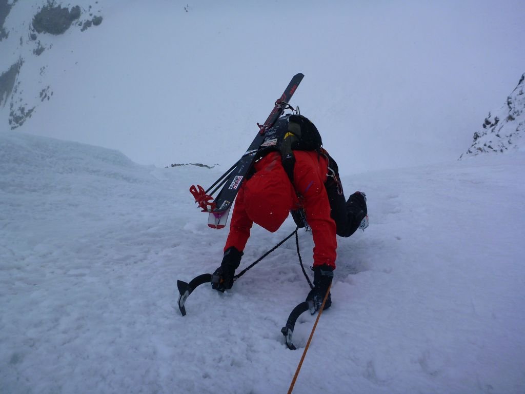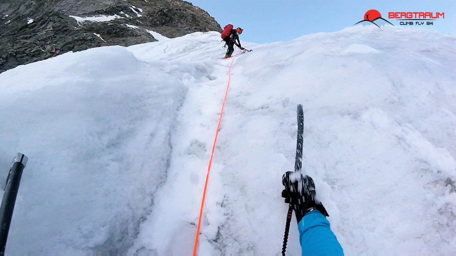Firn bzw. Eis bis 80° (Var. links auch steiler) - Hochalpine steile Eistour, kompl. Eisausrüstung und Seil sind erforderlich. Auch der Abstieg ist äußerst anspruchsvoll - brüchiges Blockgelände.