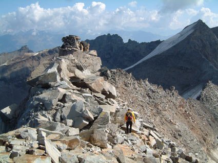 Auch der Abstieg ist äußerst anspruchsvoll - brüchiges Blockgelände. Da der Abstieg und die Tour sehr steinschlaggefährdet sind, ist früher Aufbruch ratsam!