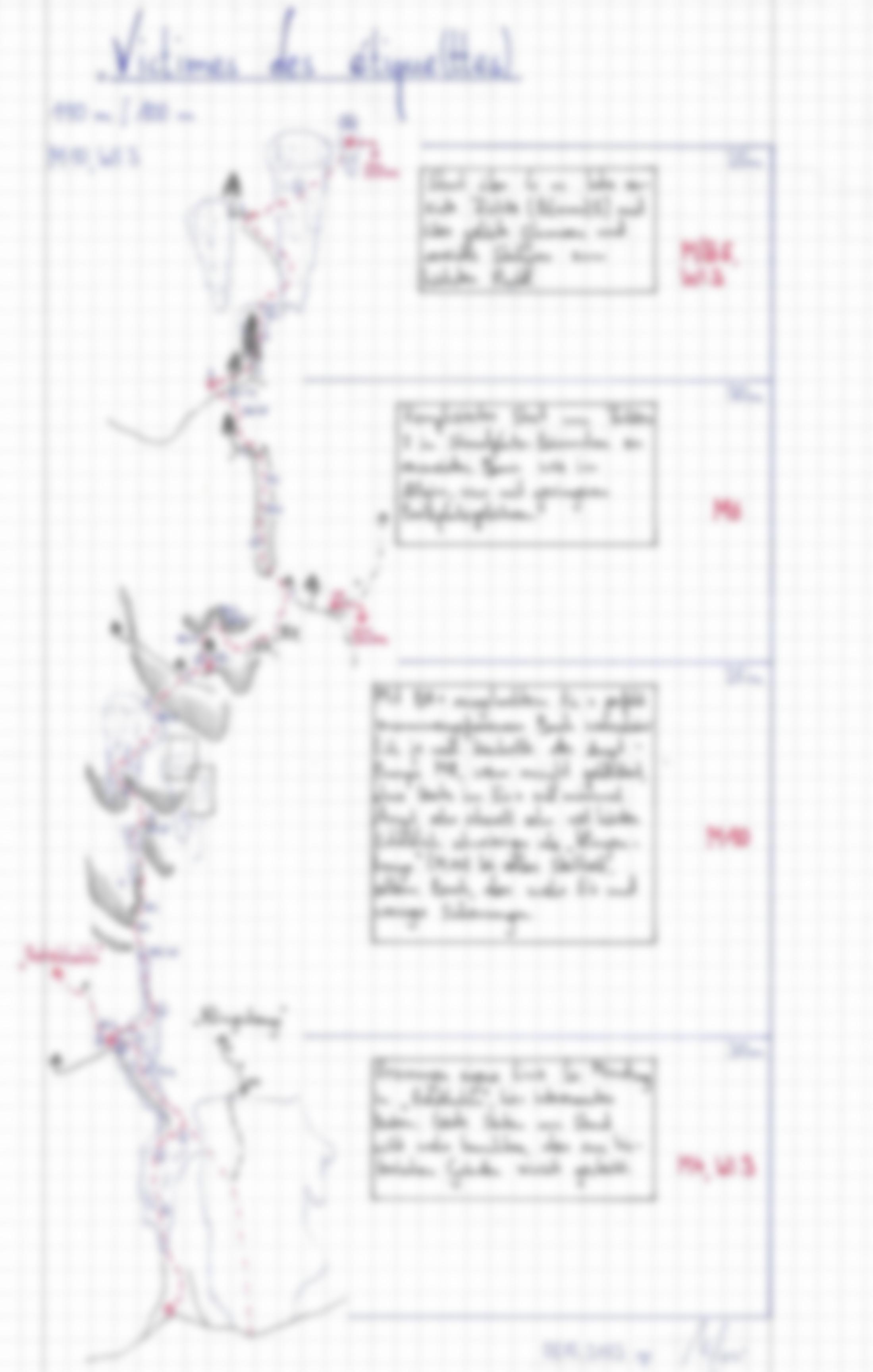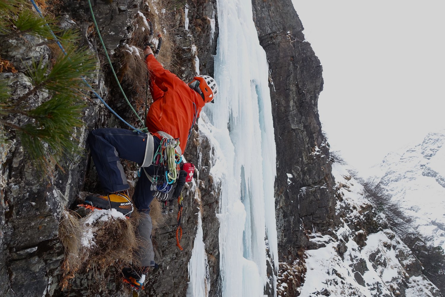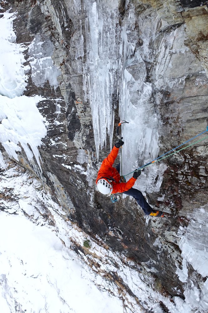 Nach den ersten 20 Metern im leichten Eis benutzt die Linie auf 10 Meter die "Rotzklacheln" (A. Orgler 1998) um auf das große Band unterhalb der riesigen Überhänge zu kommen. Dann schießen die "Victimes des étique(ttes)" mit 4 Schlaghaken 25 Meter gerade durch die von filigranen Zapfen und dünnen Glasuren gespickten Dächer, immer gerade weiter über geniale Graspolster-Kletterei und über vereiste Fichten bis zum höchten Punkt im Eis.