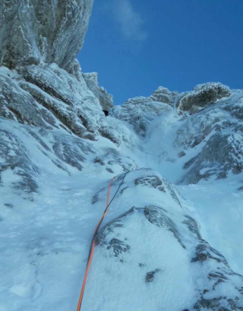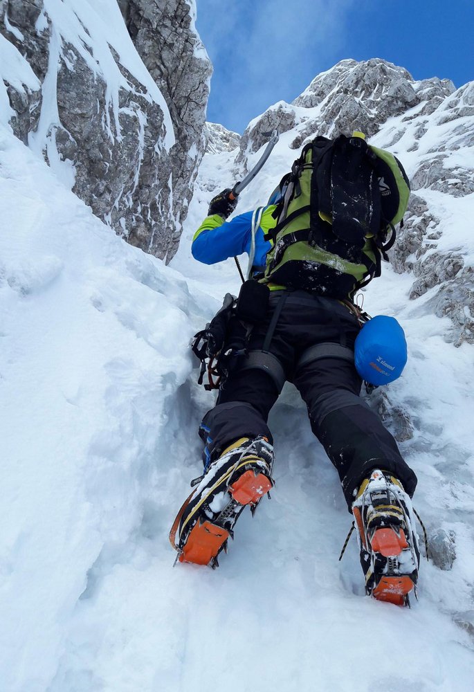 Bei den richtigen Bedingungen im Winter sehr schöne kombinierte Kletterroute auf Fels, Wassereis und hartem Trittfirn. Im Talkessel befinden sich noch etliche andere Routen, welche im Winter bei den richtigen Bedingungen schöne Mixedklettereien bieten. Zu beachten ist auf jeden Fall die Lawinengefahr, da sowohl der Zustieg aber auch vor allem der Abstieg über teilweise steile Schneehänge führen. Optimale Bedingungen bilden sich wie immer in solchen Wänden nach niederschlagsreichen Zeiten im Winter, auf welche dann wechselnde Warm- und Kaltperioden folgen. Dies führt dann zur erforderlichen Bildung der Eisglasuren. Für die Absicherung ist bis auf einigen Stände mit Normalhaken (wie in Slowenien üblich) immer selbst zu sorgen (Keile, Friends und kurze Eisschrauben). Es empfiehlt sich die Mitnahme eines kleinen Hakensortiments.
