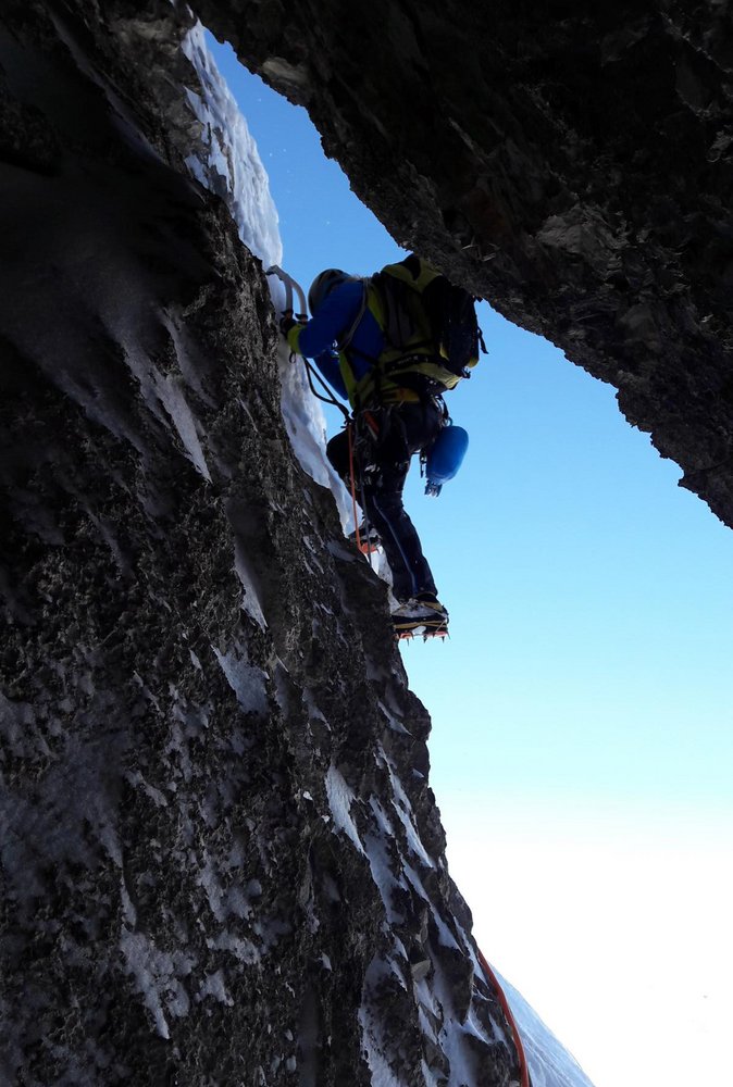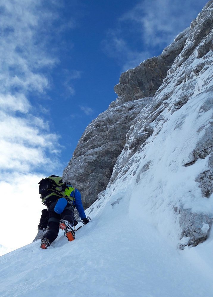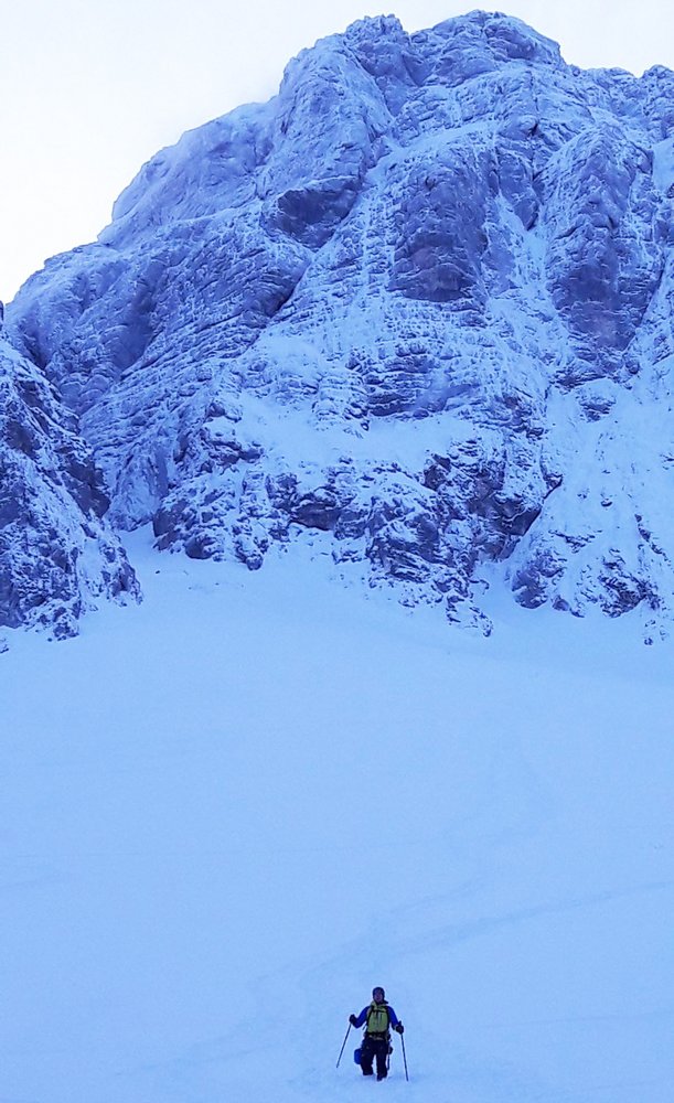 Komplette Nordwand- und Lawinenausrüstung. Es kann auch mit Tourenski zum Einstieg zugestiegen werden, da man an diesem Punkt im Abstieg wieder vorbeikommt.