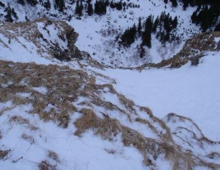 Zu Fuß leicht ansteigend in südlicher Richtung. Die erste markante Rinne zur Traualpe absteigen. VORSICHT: Sehr Lawinengefährlich. Alternativ über den Fall an Abalakov bis zur großen Schneestufe, hier nach Süden den letzten Abbruch umgehen.