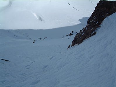 Rechts vom markanten Felsriegel in Gipfelfalllinie befindet sich ein großes Eisfeld das man nach Überwindung der Randspalte leicht rechtsquerend aufsteigt. An einer markante Felsecke gibt es zwei Möglichkeiten des Weiterweges. Durch eine kleine Rinne bis zum Nordgrat aufsteigen und diesen weiter zum Gipfel, oder leicht rechts weiter bis man kurz vor dem Gipfel auf den Westgrat trifft. Beide Linien sind ungefähr gleich schwierig, wobei die rechte Variante objektiv etwas sicherer sein dürfte.